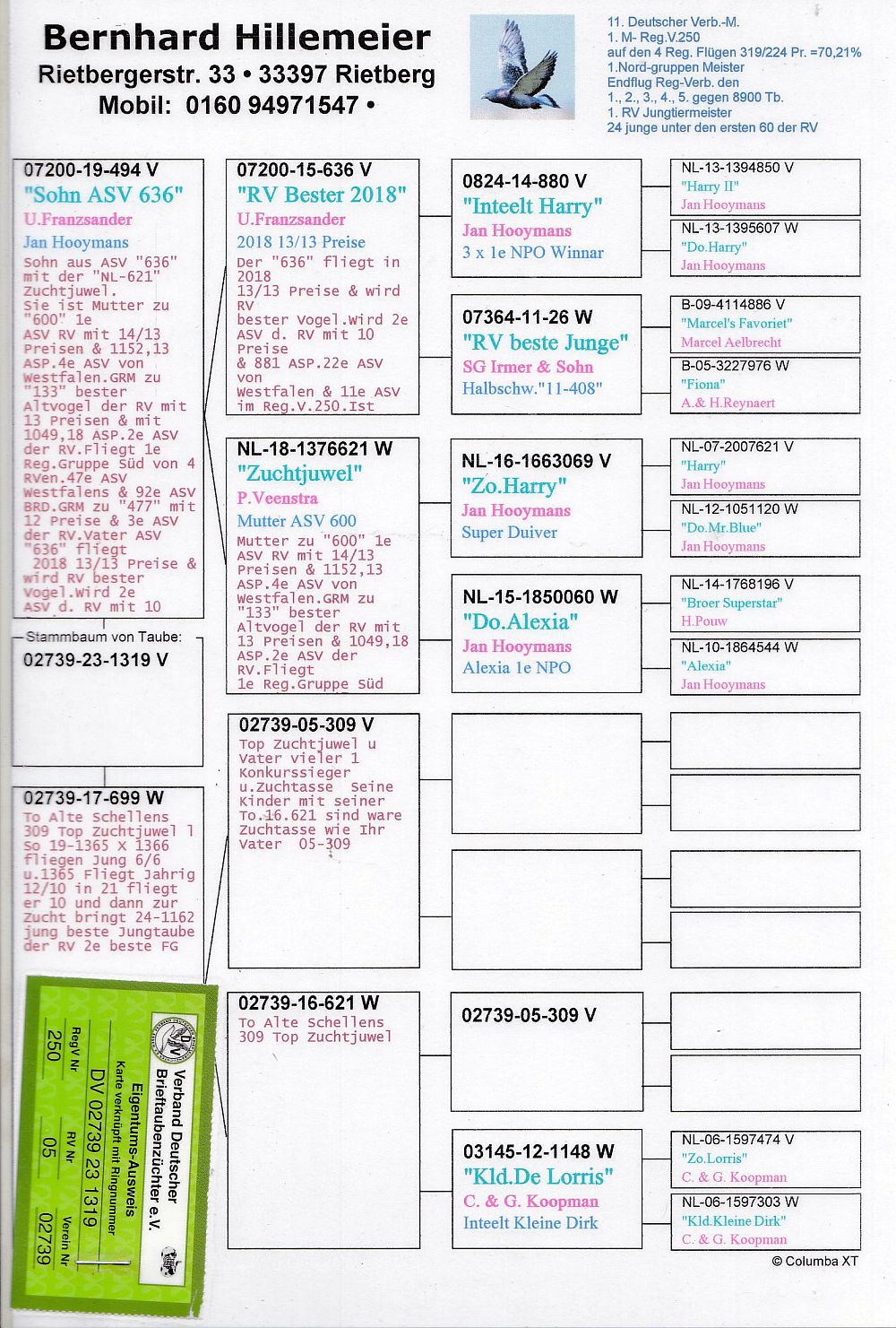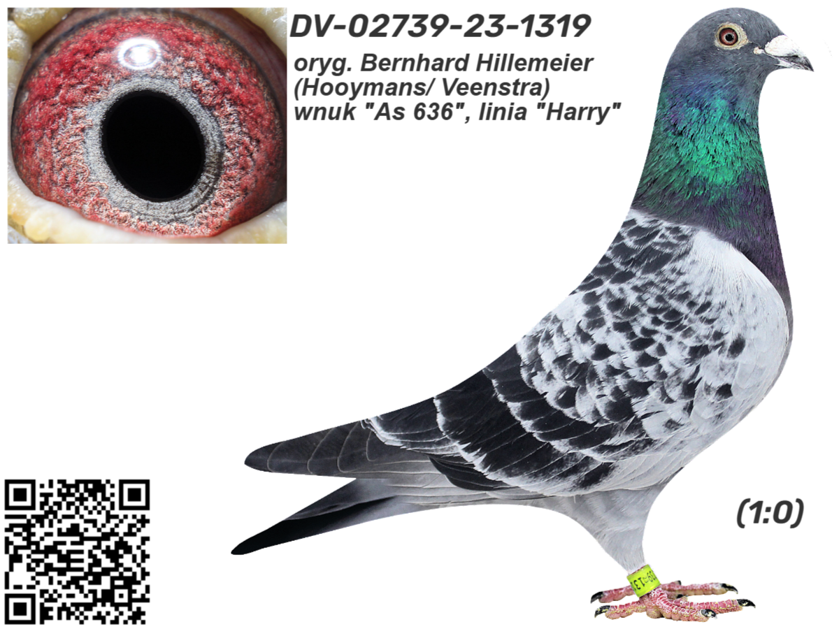 oryg. Bernhard Hillemeier (Hooymans/ Veenstra), wnuk "As 636", linia "Harry" Szczegóły pochodzenia w rodowodzie. Gołąb jest sprzedawany bezpośrednio od hodowcy i znajduje się w Polsce, można go obejrzeć w miejscowości Zblewo (woj. pomorskie), po wcześniejszym kontakcie telefonicznym. Więcej informacji o gołębiu i transporcie pod nr tel.: 511 607 710.