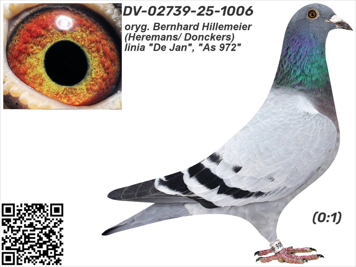 oryg. Bernhard Hillemeier (Heremans/ Donckers), linia "De Jan", "As 972" Szczegóły pochodzenia w rodowodzie. Gołąb jest sprzedawany bezpośrednio od hodowcy i znajduje się w Polsce, można go obejrzeć w miejscowości Zblewo (woj. pomorskie), po wcześniejszym kontakcie telefonicznym. Więcej informacji o gołębiu i transporcie pod nr tel.: 511 607 710.