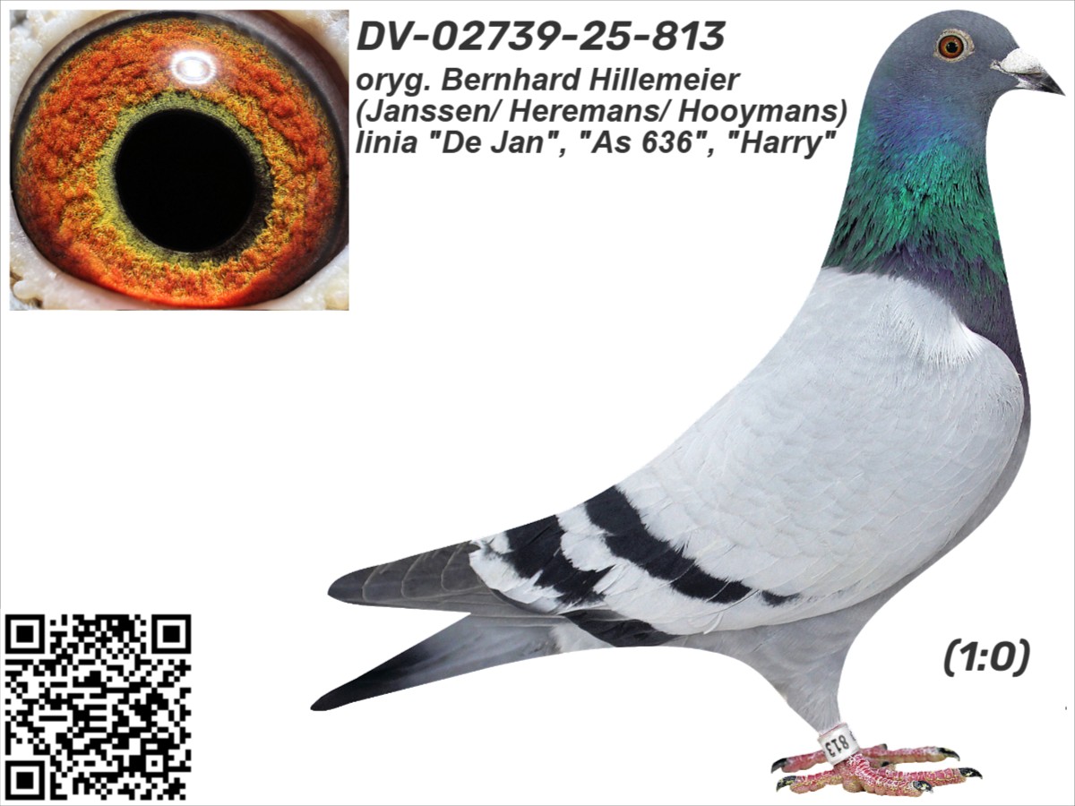 oryg. Bernhard Hillemeier (Janssen/ Heremans/ Hooymans), linia "De Jan", "As 636", "Harry" Szczegóły pochodzenia w rodowodzie. Gołąb jest sprzedawany bezpośrednio od hodowcy i znajduje się w Polsce, można go obejrzeć w miejscowości Zblewo (woj. pomorskie), po wcześniejszym kontakcie telefonicznym. Więcej informacji o gołębiu i transporcie pod nr tel.: 511 607 710.