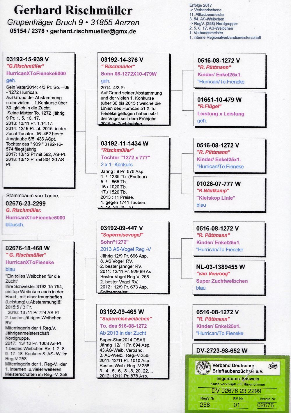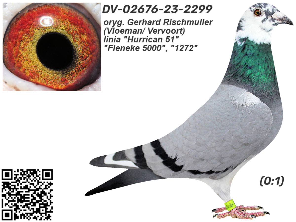 oryg. Gerhard Rischmuller (Vloemans/ Vervoort), linia "Hurrican 51", "Fieneke 5000", "1272" Szczegóły pochodzenia w rodowodzie. Gołąb jest sprzedawany bezpośrednio od hodowcy i znajduje się w Polsce, można go obejrzeć w miejscowości Zblewo (woj. pomorskie), po wcześniejszym kontakcie telefonicznym. Więcej informacji o gołębiu i transporcie pod nr tel.: 511 607 710.