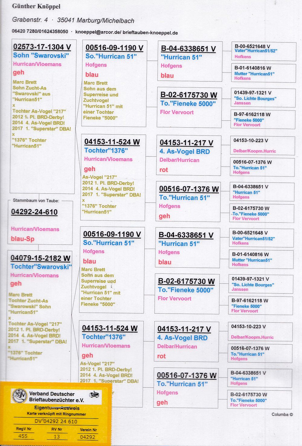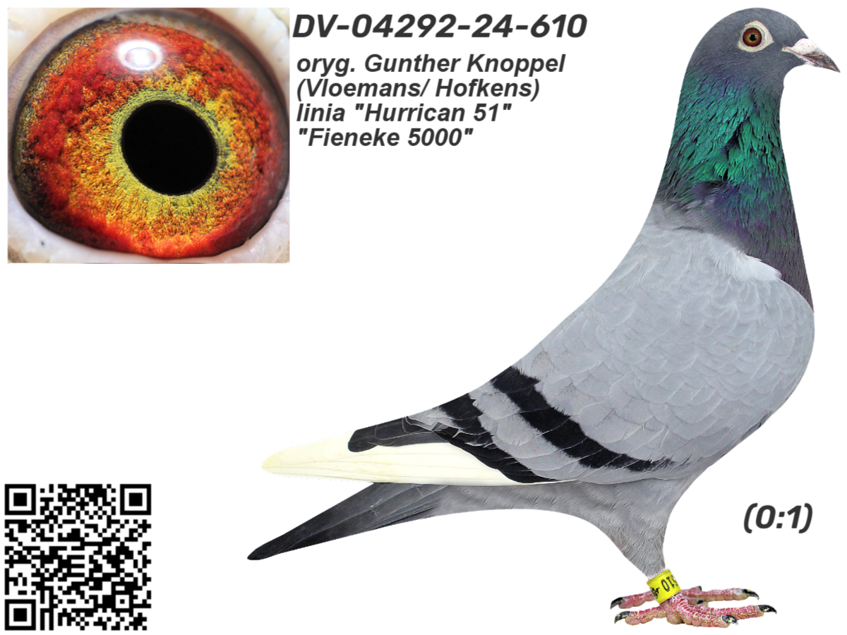 oryg. Gunther Knoppel (Vloemans/ Hofkens), linia "Hurrican 51", "Fieneke 5000" Szczegóły pochodzenia w rodowodzie. Gołąb jest sprzedawany bezpośrednio od hodowcy i znajduje się w Polsce, można go obejrzeć w miejscowości Zblewo (woj. pomorskie), po wcześniejszym kontakcie telefonicznym. Więcej informacji o gołębiu i transporcie pod nr tel.: 511 607 710.
