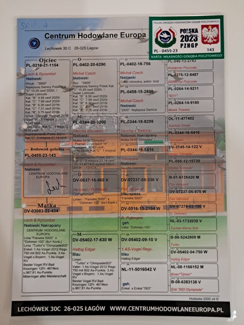 PL-0455-23-143 oryg. Centrum Hodowlane Europa Wnuk najlepszej samicy Polski kat.C x Turbo Olimpiade 003, Fieneke 5000