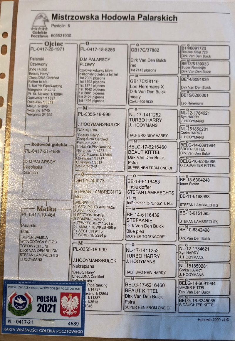 Oryginalny gołąb z hodowli Dominika Palarskiego. Szczegóły pochodzenia w rodowodzie. Więcej informacji pod nr tel.: 668414262 *transport kurierem ok. 150 zł