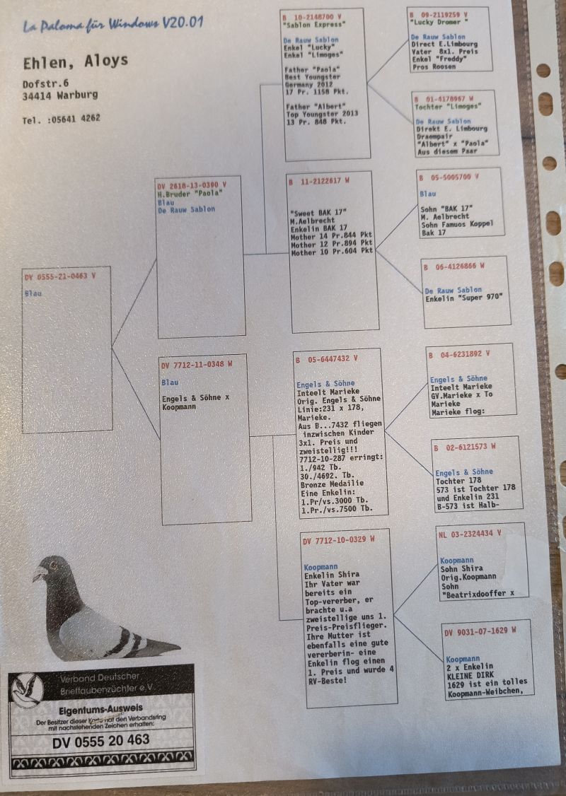Oryginalny gołąb z hodowli Aloys Ehlen. Szczegóły pochodzenia w rodowodzie. Więcej informacji pod nr tel.: 668414262 *transport kurierem ok. 150 zł