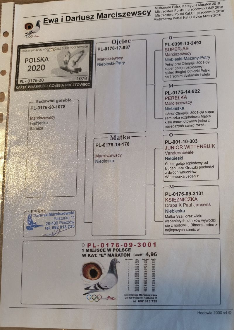 Oryginalny gołąb z hodowli Ewa i Dariusz Marciszewscy. Szczegóły pochodzenia w rodowodzie. Więcej informacji pod nr tel.: 668414262 *transport kurierem ok. 150 zł