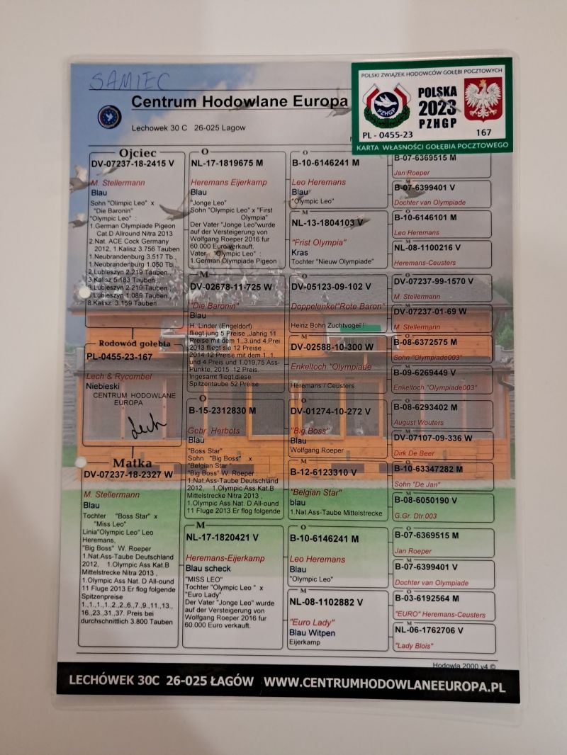 PL-0455-23-167 oryg. Centrum Hodowlane Europa Leo Heremans "Olympic Leo" - G. Herbots "Big Boss"