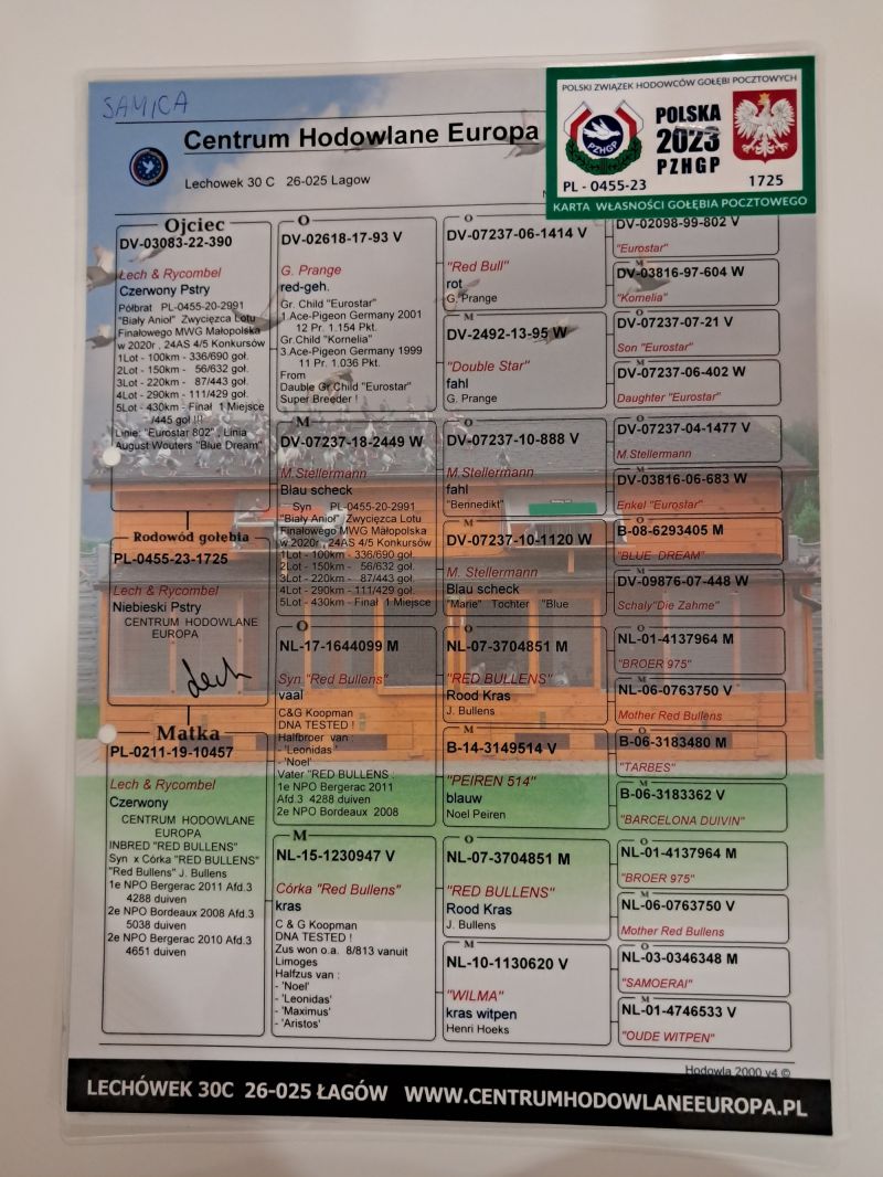 PL-0455-23-1725 oryg. Centrum Hodowlane Europa Inbred "Red Bullens" x półbrat "Biały Anioł" Lech&Rycombel x G. Prange "Eurosta