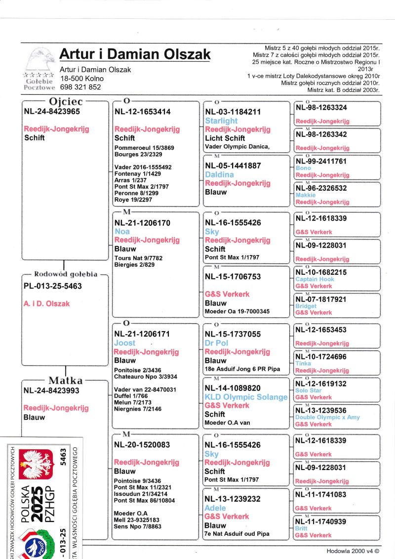 Rodzice młodego pochodzą od v-ce mistrzów Holandii Kat. A 2024, mistrzów Holandii z 2007 i 2015. Reedijk - Jongekrijg byli w posiadaniu 30 oryginalnych gołębi braci Janssen. Gołąb zaszczepiony przeciwko paramiksowirozie. Więcej informacji udzielę telefonicznie.