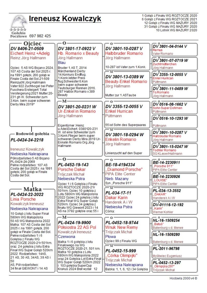 Gołąb z hodowli Ireneusz Kowalczyk. Informację o gołębiu dostępne w rodowodzie. Więcej informacji pod numerem telefonu: 697-982-425. Wysyłka po stronie kupującego