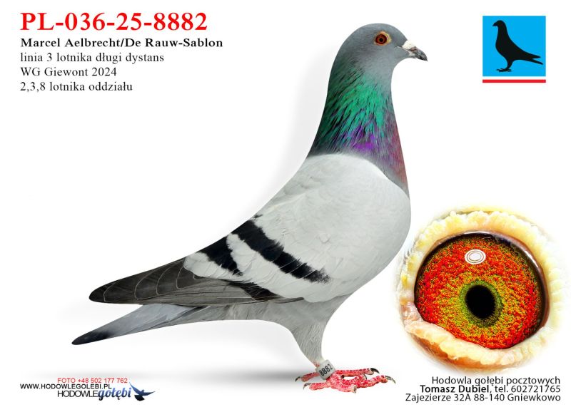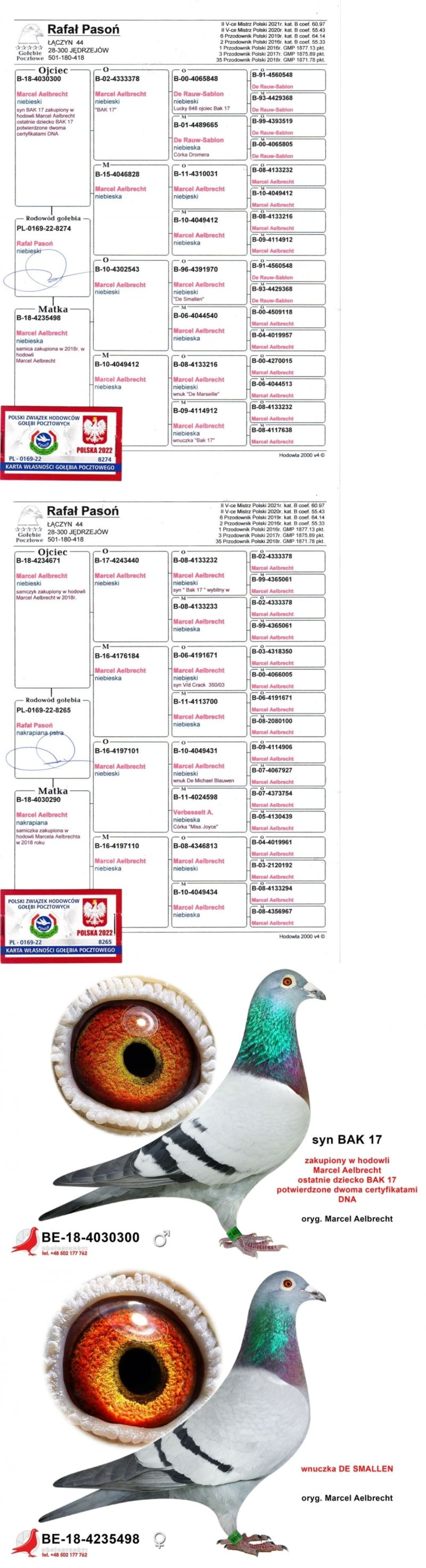 Prawdopodobnie Samica. z linii 550 x 107. Po gołębiach tych posiadam super gołębie rozpłodowe. W krótkim czasie ich dzieci jak i one same dały mi super lotniki, między innymi 2 i 3 lotnika oddziału, oraz wiele innych wartościowych lotników w lotach młodych i starych. Przepiękne gołębie na wymagające loty. Najlepsze umięśnienie, super budowa i aksamitne upierzenie. Do tego super wyniki na WG. U mnie WG Bojano 2023 wnuk 12 miejsce półfinał, 2024 wnuk 34 miejsce półfinał. U innych hodowców 2022 roku córka 107 wydała 4 gołębia z finału WG Mazury! W 2024 syn 107 x 550 wydał 3 ASA długi dystans, 7 miejsce Super Finał 515 km!!! ****************************************** Moje stado opiera się na ptakach które w latach 2012-2016 pozwoliły mi wygrywać w oddziale i okręgu w różnych kategoriach, lecąc w 2 różnych oddziałach 036 i 0394. Najważniejsze osiągnięcia to Mistrz okręgu kat. C 49 miejsce w Polsce, II vice Mistrz okręgu kat. B i młode, Super Mistrz Oddziału. Wszystkie wyniki dokładnie opisane na końcu aukcji. Do lotowania wróciłem „na chwilę” w 2021 r. na nowym miejscu zamieszkania w bardzo ciężkim sezonie 3 x vice Mistrz Oddziału gołębi młodych. 2,5,11,16,19,22,23,27,28,40 pozycje w klasyfikacji lotników. 3 x Mistrz sekcji oraz XIII przodownika okręgu Bydgoszcz. Zacząłem też lotowanie na WG wysyłając po kilka sztuk na sezon. 2021 – konkursy na finałach na WG Krakus i Super Gołąb, 2022 - 14 miejsce Extra Finał 518 km WG Super Gołąb, 2023 – 11 miejsce Finał 502 km WG Bojano. 2024 - 4 miejsce Półfinał WG Tatry, WG Bojano 4 miejsce lot konkursowy, 34 miejsce Półfinał, 17 miejsce Drużyna, 54, 78, 79, 81 lotnik. Po moich gołębiach w 2024 ptaki wylatały: po pełnej parze 68 miejsce Finał Super Gołąb, po samcu 8 miejsce Extra Finał WG Warmia, po samicy 16 miejsce Finał WG Roztocze, po samcu 3 AS długi dystans i 7 miejsce Extra Finał MWG Giewont. 2025 31 lotnik Derby Carmelo Yupi, 43 miejsce Extra Finał WG Tatry, 12 miejsce Finał WG Carpatia, 40 miejsce Finał WG Krakus (56 seria na 849 hodowców 2/2 w konkursie z 3 wysłanych ptaków), po samicy ode mnie 24 miejsce Finał Corabia One Loft Race. ********************** Wszystkie gołębie przyjęły komplet szczepień(Pharmavac, salmovir + ospa). Więcej informacji w rodowodach, zapraszam też do kontaktu telefonicznego, mailowego bądź WhatsApp. ********************* TRANSPORT, ptaki zostaną dostarczone transportem prywatnym w połowie grudnia, cena 1-2 szt. 100 zł, 3-6 szt. 150 zł, 7 i więcej 200 zł. Koszty transportu płatne kierowcy, za gołębie kierowcy bądź na konto, jak wygodniej. Istnieje również możliwość wcześniejszej wysyłki kurierskiej w cenie 150 zł do 6 szt. Zapraszam również do odbioru osobistego.