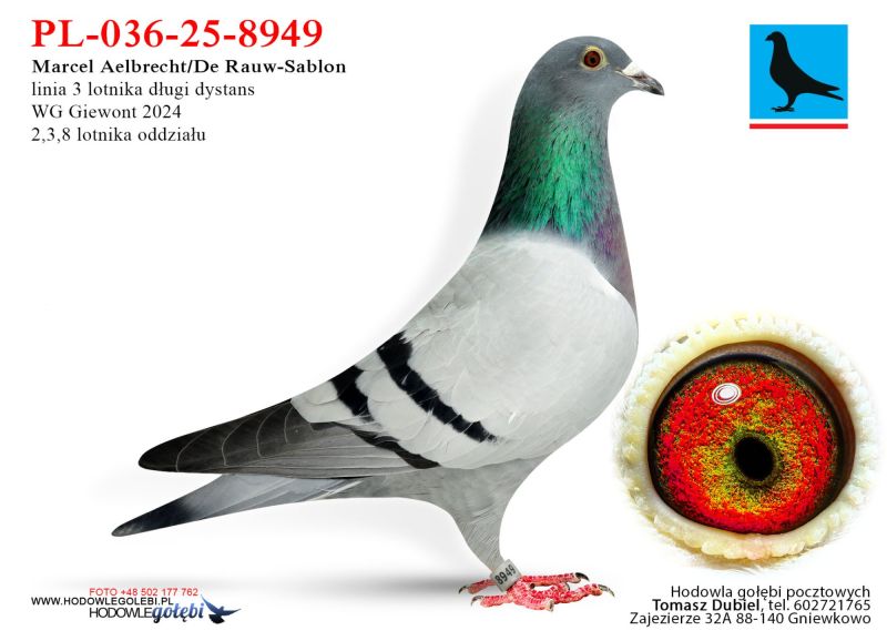 Prawdopodobnie super Samica. Ptaki z linii 550 x 107. Po gołębiach tych posiadam super gołębie rozpłodowe. W krótkim czasie ich dzieci jak i one same dały mi super lotniki, między innymi 2 i 3 lotnika oddziału, oraz wiele innych wartościowych lotników w lotach młodych i starych. Przepiękne gołębie na wymagające loty. Najlepsze umięśnienie, super budowa i aksamitne upierzenie. Do tego super wyniki na WG. U mnie WG Bojano 2023 wnuk 12 miejsce półfinał, 2024 wnuk 34 miejsce półfinał. U innych hodowców 2022 roku córka 107 wydała 4 gołębia z finału WG Mazury! W 2024 syn 107 x 550 wydał 3 ASA długi dystans, 7 miejsce Super Finał 515 km!!! ****************************************** Moje stado opiera się na ptakach które w latach 2012-2016 pozwoliły mi wygrywać w oddziale i okręgu w różnych kategoriach, lecąc w 2 różnych oddziałach 036 i 0394. Najważniejsze osiągnięcia to Mistrz okręgu kat. C 49 miejsce w Polsce, II vice Mistrz okręgu kat. B i młode, Super Mistrz Oddziału. Wszystkie wyniki dokładnie opisane na końcu aukcji. Do lotowania wróciłem „na chwilę” w 2021 r. na nowym miejscu zamieszkania w bardzo ciężkim sezonie 3 x vice Mistrz Oddziału gołębi młodych. 2,5,11,16,19,22,23,27,28,40 pozycje w klasyfikacji lotników. 3 x Mistrz sekcji oraz XIII przodownika okręgu Bydgoszcz. Zacząłem też lotowanie na WG wysyłając po kilka sztuk na sezon. 2021 – konkursy na finałach na WG Krakus i Super Gołąb, 2022 - 14 miejsce Extra Finał 518 km WG Super Gołąb, 2023 – 11 miejsce Finał 502 km WG Bojano. 2024 - 4 miejsce Półfinał WG Tatry, WG Bojano 4 miejsce lot konkursowy, 34 miejsce Półfinał, 17 miejsce Drużyna, 54, 78, 79, 81 lotnik. Po moich gołębiach w 2024 ptaki wylatały: po pełnej parze 68 miejsce Finał Super Gołąb, po samcu 8 miejsce Extra Finał WG Warmia, po samicy 16 miejsce Finał WG Roztocze, po samcu 3 AS długi dystans i 7 miejsce Extra Finał MWG Giewont. 2025 31 lotnik Derby Carmelo Yupi, 43 miejsce Extra Finał WG Tatry, 12 miejsce Finał WG Carpatia, 40 miejsce Finał WG Krakus (56 seria na 849 hodowców 2/2 w konkursie z 3 wysłanych ptaków), po samicy ode mnie 24 miejsce Finał Corabia One Loft Race. ********************** Wszystkie gołębie przyjęły komplet szczepień(Pharmavac, salmovir + ospa). Więcej informacji w rodowodach, zapraszam też do kontaktu telefonicznego, mailowego bądź WhatsApp. ********************* TRANSPORT, ptaki zostaną dostarczone transportem prywatnym w połowie grudnia, cena 1-2 szt. 100 zł, 3-6 szt. 150 zł, 7 i więcej 200 zł. Koszty transportu płatne kierowcy, za gołębie kierowcy bądź na konto, jak wygodniej. Istnieje również możliwość wcześniejszej wysyłki kurierskiej w cenie 150 zł do 6 szt. Zapraszam również do odbioru osobistego.