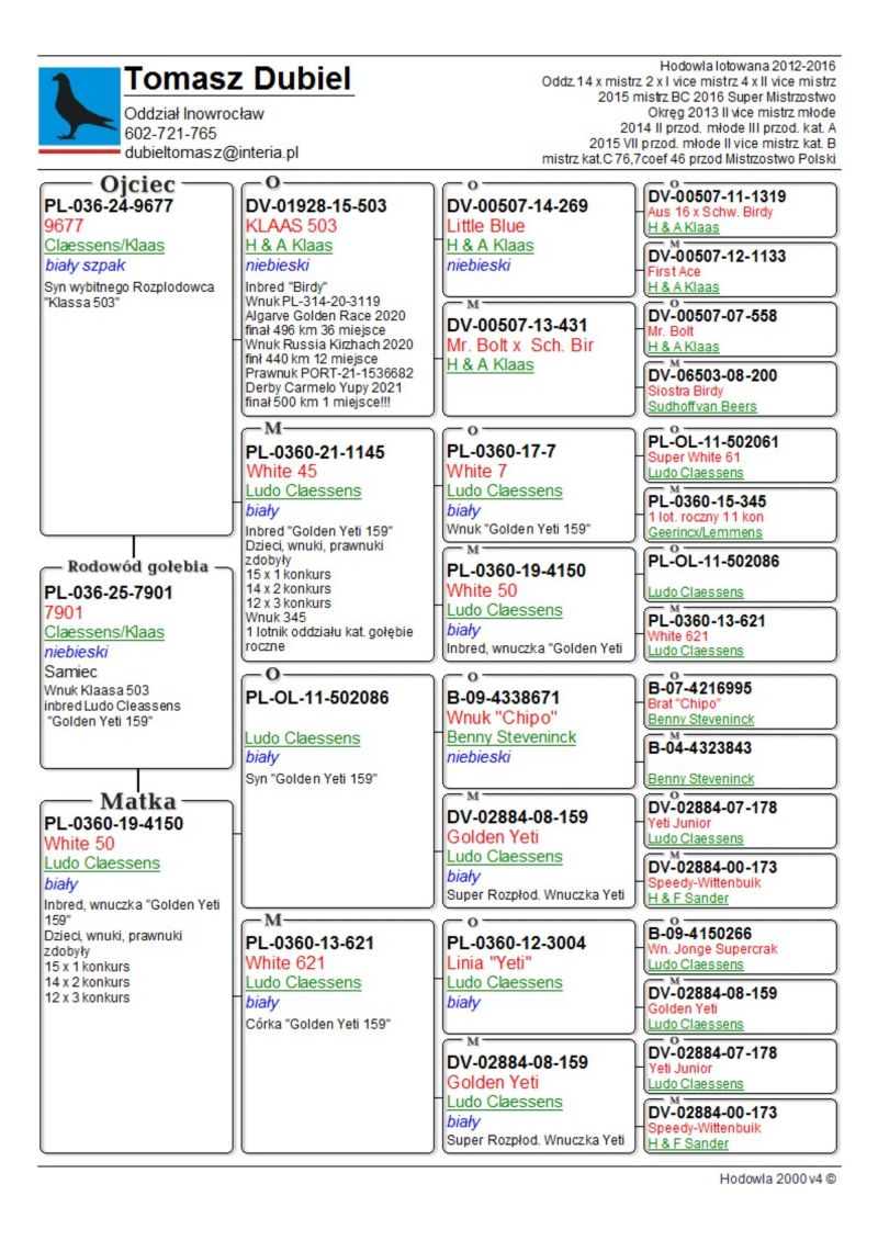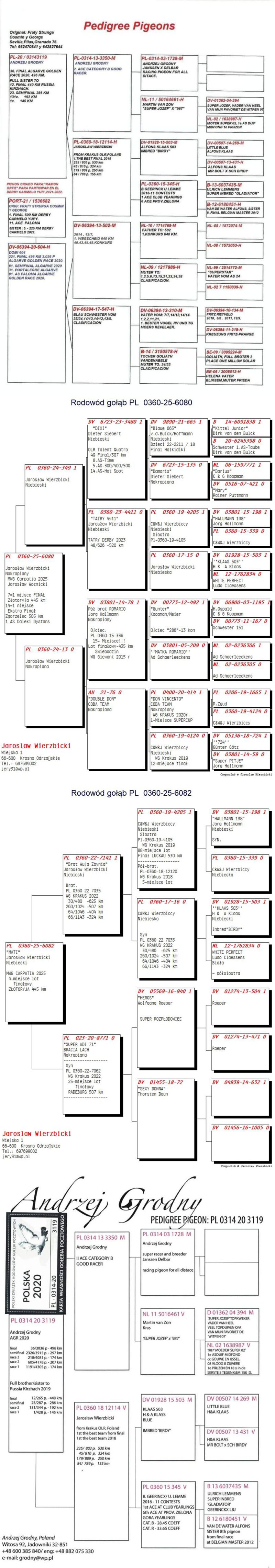 Bardzo dobrze zbudowany samiec. Super pierwsze wrażenie. Białe od kolegi Jarka Wierzbickiego to piękne twarde gołębie. Super latają w domu i na WG. ****************************************** Moje stado opiera się na ptakach które w latach 2012-2016 pozwoliły mi wygrywać w oddziale i okręgu w różnych kategoriach, lecąc w 2 różnych oddziałach 036 i 0394. Najważniejsze osiągnięcia to Mistrz okręgu kat. C 49 miejsce w Polsce, II vice Mistrz okręgu kat. B i młode, Super Mistrz Oddziału. Wszystkie wyniki dokładnie opisane na końcu aukcji. Do lotowania wróciłem „na chwilę” w 2021 r. na nowym miejscu zamieszkania w bardzo ciężkim sezonie 3 x vice Mistrz Oddziału gołębi młodych. 2,5,11,16,19,22,23,27,28,40 pozycje w klasyfikacji lotników. 3 x Mistrz sekcji oraz XIII przodownika okręgu Bydgoszcz. Zacząłem też lotowanie na WG wysyłając po kilka sztuk na sezon. 2021 – konkursy na finałach na WG Krakus i Super Gołąb, 2022 - 14 miejsce Extra Finał 518 km WG Super Gołąb, 2023 – 11 miejsce Finał 502 km WG Bojano. 2024 - 4 miejsce Półfinał WG Tatry, WG Bojano 4 miejsce lot konkursowy, 34 miejsce Półfinał, 17 miejsce Drużyna, 54, 78, 79, 81 lotnik. Po moich gołębiach w 2024 ptaki wylatały: po pełnej parze 68 miejsce Finał Super Gołąb, po samcu 8 miejsce Extra Finał WG Warmia, po samicy 16 miejsce Finał WG Roztocze, po samcu 3 AS długi dystans i 7 miejsce Extra Finał MWG Giewont. 2025 31 lotnik Derby Carmelo Yupi, 43 miejsce Extra Finał WG Tatry, 12 miejsce Finał WG Carpatia, 40 miejsce Finał WG Krakus (56 seria na 849 hodowców 2/2 w konkursie z 3 wysłanych ptaków), po samicy ode mnie 24 miejsce Finał Corabia One Loft Race. ********************** Wszystkie gołębie przyjęły komplet szczepień(Pharmavac, salmovir + ospa). Więcej informacji w rodowodach, zapraszam też do kontaktu telefonicznego, mailowego bądź WhatsApp. ********************* TRANSPORT, ptaki zostaną dostarczone transportem prywatnym w połowie grudnia, cena 1-2 szt. 100 zł, 3-6 szt. 150 zł, 7 i więcej 200 zł. Koszty transportu płatne kierowcy, za gołębie kierowcy bądź na konto, jak wygodniej. Istnieje również możliwość wcześniejszej wysyłki kurierskiej w cenie 150 zł do 6 szt. Zapraszam również do odbioru osobistego.