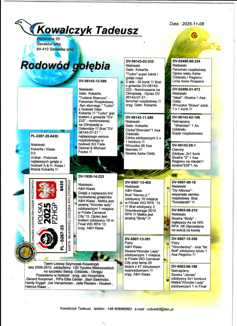 PL-0287-25-8430 Unikat - Potomek najlepszych gołębi z hodowli Kokartis/Klaas