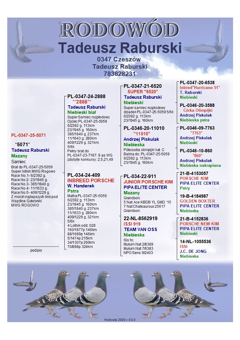 Hodowla skupiona w lotach gołębi na wspólnych gołębnikach z wieloma sukcesami. Zaprasza Państwa do licytacji wartościowego materiału do dalszej hodowli. Proponowany gołąb to syn mojej bazowej pary rozpłodowej x lnbred Porsche 911, 4 lotnik Oddziału 028, brat do 5059 11 AS WG do finału 6,11,23,385,409K! Więcej informacji w rodowodzie oraz pod nr. tel. Uwaga WYSYŁKA 100ZŁ