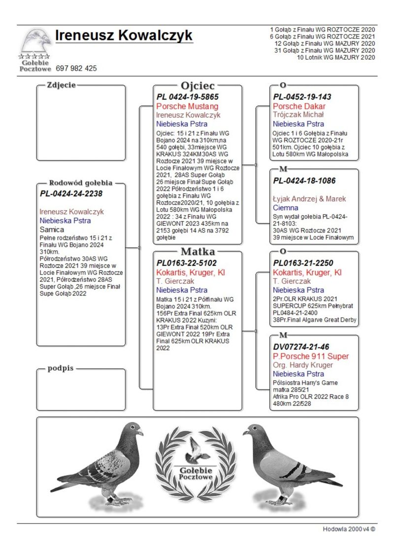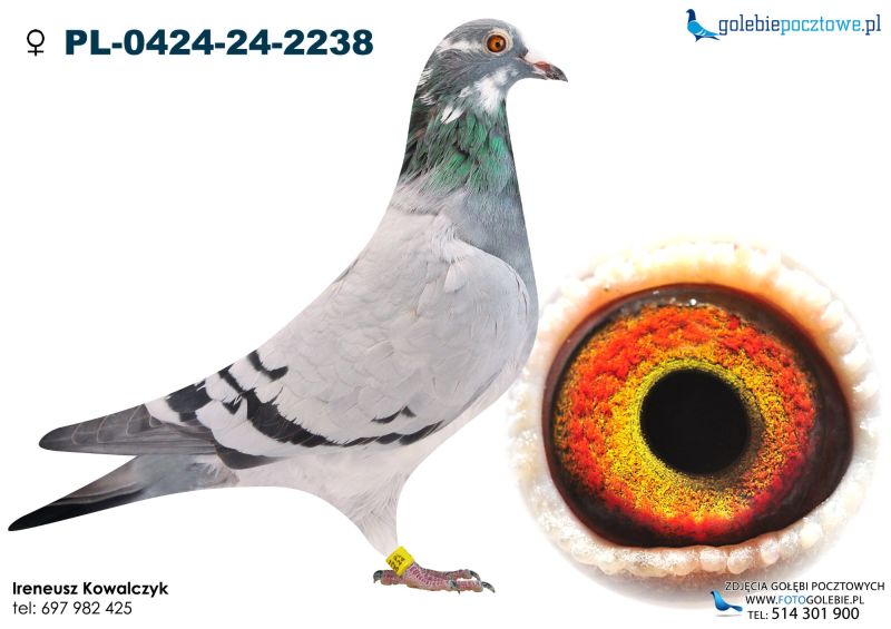 Gołąb z hodowli Ireneusz Kowalczyk. Informację o gołębiu dostępne w rodowodzie. Więcej informacji pod numerem telefonu: 697-982-425. Wysyłka po stronie kupującego