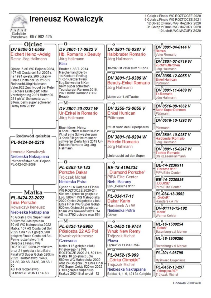 Gołąb z hodowli Ireneusz Kowalczyk. Informację o gołębiu dostępne w rodowodzie. Więcej informacji pod numerem telefonu: 697-982-425. Wysyłka po stronie kupującego