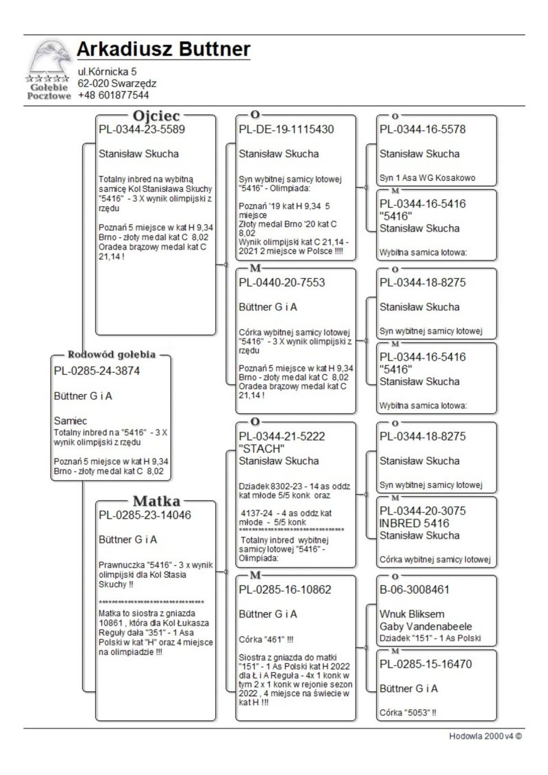 Zdjęcie z zeszłego roku, piękny samczyk - inbred na 5416 - 3 x z rzędu wynik olimpijski dla Kol Stasia Skuchy a ze strony matki babka jest siostrą z gniazda do matki olimpijki i 1 Asa Polski w kat H dla Kol Łukasza Reguły oraz samczyk ze strony matki jest też prawnukiem mojego najlepszego samca rozpłodowego - oryg od Gaby Vandenabeele (wnuk Bliksem) ! "461" najważniejsze referencje z 2024 roku: 1 As Rejonu z 8 lotów rejonowych - prawnuczka 461 u Kol Adama Gasperowicza, prawnuk "461" wygrał finał na WG Podhale wygrywając 50 000 dla Kolegi Bogdana Bieli !- liczba jedynek jego wnuków , prawnuków i oczywiście dzieci będzie około stu a kilkadziesiąt gołębi z 461 zajmowało top 10 w kat As w różnych kategoriach w różnych okręgach w Polsce- tylko w 2022 roku w 9 różnych oddziałach przeważnie prawnuki zdobywały 1 lokatę w oddz !!! Jego wnuczka została też na olimpiadzie w tym roku 4 gołębiem świata w kat H dla Kol Łukasza Reguły. !! Na screenie przykład jak potrafią siadać gołębie w oddz z linii 461 ... 3-prawnuk,4 -wnuk , 5-wnuk , 6 - roczna wnuczka - kat A 9 z groszem ma , 7 wnuk , 11 - wnuk oraz 15 - wnuk 461. oraz kolejny lot z 2020 roku : 1,2,3,5,7,8 wnuk oraz 15 prawnuk ? do tego roczna samiczka Kolegów Piotra I Marcina Żureckich z Kępna została 6 asem Polski w kat G ...tak leciała... 2 na 5200 g ze 174 km 8 na 4573 z 219 km 8 na 3583 g z 324 km 8 na 1764 g z 324 g 21 na 4535 g z 549 km - rej - coeff jak widać na zdjęciu 13,54 miała też szósty super lot była 25 na 4984 g coeff 5,02 1 goląb z Extra finału na WG Giewont 2022 dla Teamu Chudy-Molek to też linia "461" ojciec to syn mojej super wdowy 2161-12 ,, Dwie Prawnuczki .... u Kol Kazimierza Goździejewskiego ( jedna w kat M w 2023 roku miała coeff 4,84 ( 1 as okręgu Wałbrzych a druga w 2024 roku 2,58 - 2 x 1 na oddział (2 as Polski kat M w/g miesięcznika "Hodowca") - w kat "I" - coeff 9 z haczykiem), "461" to też pradziadek PL-0122-22-2219 - w 2 sezony na 21 wkładań 20 konkursów - kat A coeff 9,08 a z dwóch lat do wystaw kat A-74,86 , kat B-65,94 a kat D-72,20 W 2023 roku zdobył 1 konk na ok 4100 gołębi z miejsc Sulechów a w 2024 roku 2 x 2 konk w oddz !!! oraz pradziadek PL-0122-22-5510 w kat A w 2024 roku uzyskał coeff. 4,75 Zdobył też 1 konk na oddz z miejsc. Brzeg Dolny na 4322 gołębie !! Został też 4 Asem Polski kat krótki dystans 2024 z coeff 17 z groszem z 5 lotów do kat A właśnie dla Kolegi Jacka Orszulika !!! oraz wiele,wiele innych.....od 2017 roku 30x mistrzostwo oddz w różnych kategoriach w tym 2019-2021 3 x z rzędu supermistrzostwo oddziału Poznań, więcej lub 601 877 544