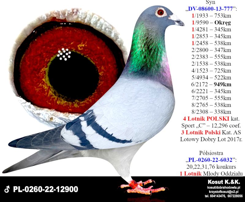 Oryginalny gołąb z hodowli Krzysztof i Kamil Kosut. Szczegóły pochodzenia w rodowodzie. Więcej informacji na stronie www.facebook.com/kosut.dobrahodowla oraz pod nr tel.: 667 228 056. Dostawa gołębi będzie realizowana po zakończeniu aukcji kurierem 165zł lub odbiór osobisty.