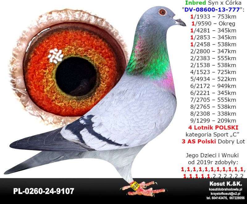 Oryginalny gołąb z hodowli Krzysztof i Kamil Kosut. Szczegóły pochodzenia w rodowodzie. Więcej informacji na stronie www.facebook.com/kosut.dobrahodowla oraz pod nr tel.: 667 228 056. Dostawa gołębi będzie realizowana po zakończeniu aukcji kurierem 165zł lub odbiór osobisty.
