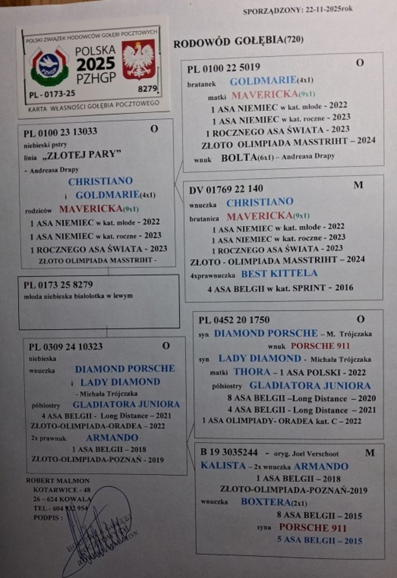 Płeć: młody gołąb Hodowca - rasa: oryg. Robert Malmon - PEC/Drapa/Trójczak/Verschoot Zakończenie: 2.12.2025 godz. 19:50