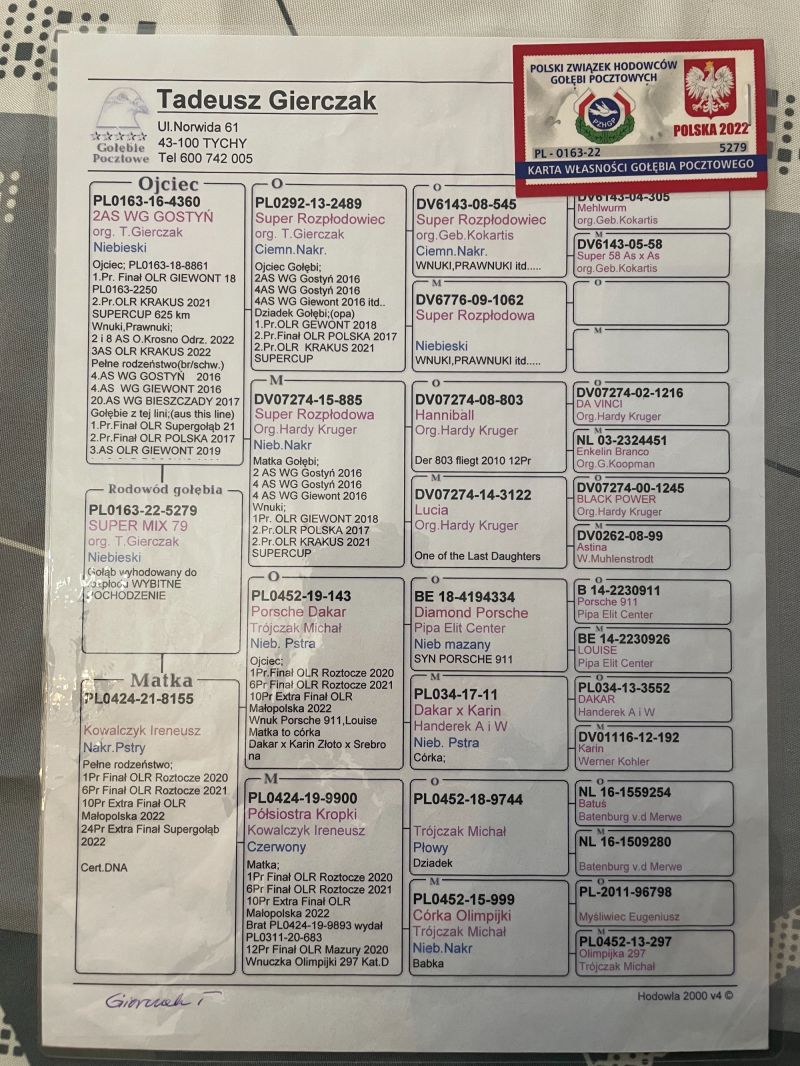 Oryginalny gołąb z hodowli Tadeusz Gierczak. Szczegóły pochodzenia w rodowodzie. Gołębie po kuracji przygotowane do lęgów. Więcej informacji pod numerem telefonu: 667 324 002 - Transport prywatnym kurierem lub odbiór osobisty.