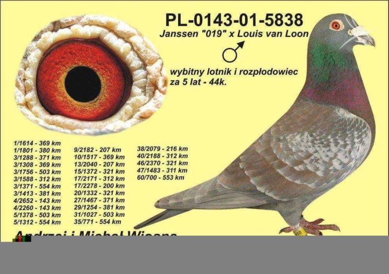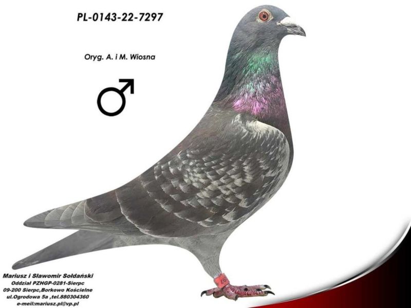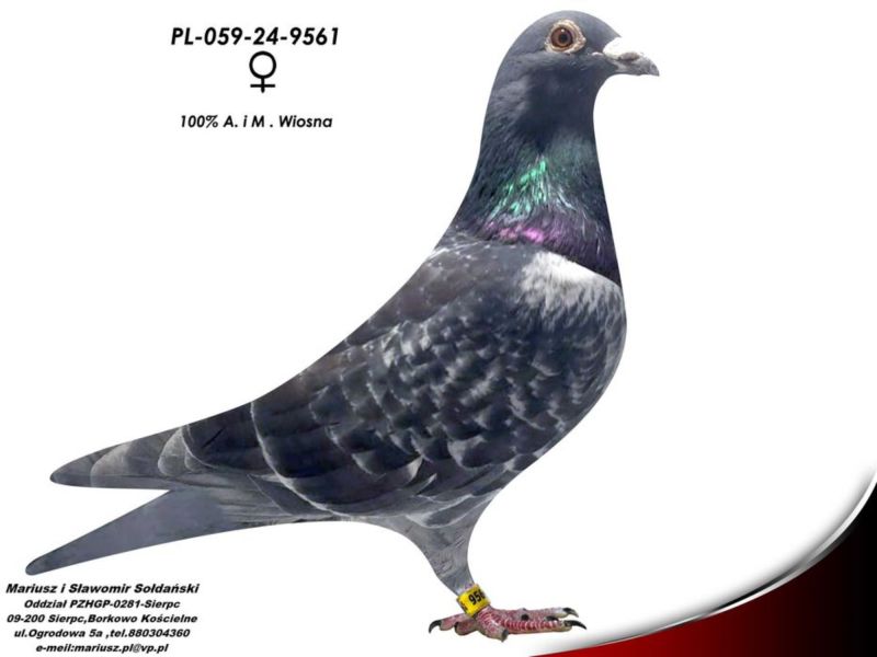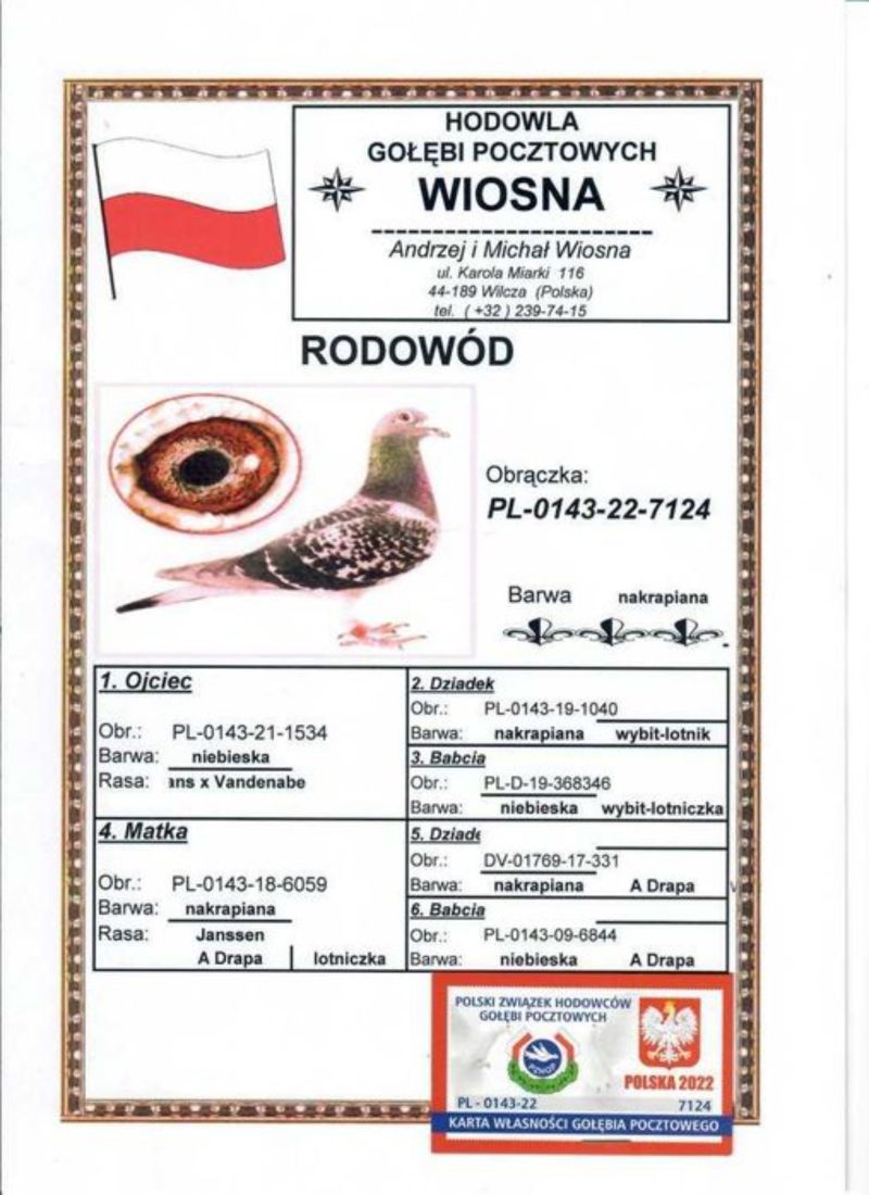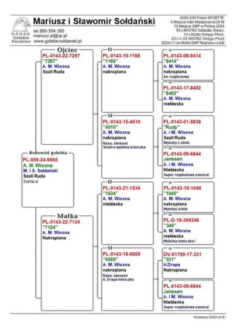 "5939" A. i M. Wiosna. Więcej informacji o gołębiu pod nr tel. i poniższych materiałach. Nasze wyniki w Mistrzostwie Polski 2018: 6 Miejsce w Intermistrzostwie Międzynarodowym - coeff. 151,73; 23 Miejsce GMP - 1874,73; 29 Miejsce Kat.B - coeff. 86,45. 1 Miejsce Gołąb Średni dystans-Konkurs Redakcji "Hodowca", 1 Miejsce Kat."B"-Konkurs Redakcji "Dobry Lot", 3 Miejsce Kat."D"-Konkurs Redakcji "Dobry Lot", 2 Miejsce "Mistrzostwo Asów Allround"-Konkurs Redakcji "Dobry Lot", 1 Miejsce Kat."B"-Konkurs Redakcji "Poradnik Hodowcy". 2019-Oddział Sierpc: Typowane Mistrz, Open I-vce Mistrz, Open 50 II-V-ce Mistrz, 1 i 3 Lotnik Roczny, Kat. A II V-ce Mistrz, Kat. B II V-ce Mistrz, Kat. D II V-ce Mistrz, Kat. GMP I v-Ce Mistrz, Kat. Inter. I V-ce Mistrz, Super. I V-ce Mistrz. Okręg Płock: II V-ce Mistrz Supermistrzostwo, I V-ce Mistrz GMP, II Lotnik. kat. B. 10 Gołębi w Reprezentacji Okręgu na Wystawę Ogółnopolską 2020. 2 AS POLSKI SPORT „B”-14,62 coef. 2020-Oddział Sierpc: Typowane Mistrz, Open I-vce Mistrz, Open 50 I-V-ce Mistrz, 1 Lotniczka Roczna, Kat. C Mistrz, Kat. M II V-ce Mistrz, Kat. D II V-ce Mistrz, Kat. GMP Mistrz, Kat. Inter. II V-ce Mistrz, Mistrz. Okręg Płock: Kat. GMP Mistrz , Kat.Roczne Mistrz, Kat. C-I Vce Mistrz , Kat. M - I Vce Mistrz Mistrz.Regionu I Łódż- V-ce Mistrz „Roczne” 2021- Supermistrz Oddziału Sierpc Mistrz Okręgu Płock Kat." Maraton" Supermistrz Okręgu Płock,2022 6 gołębi w reprezentacji Okręgu Płock na Wystawę Ogólnopolską.2022- II Supermistrz Oddziału Sierpc, 8 x V-ce Mistrz Oddziału. 1 AS WG Kaszuby 2022, 2 drużyna WG Kosakowo 2022, 4 AS WG Kosakowo. 6 AS WG Roztocze 2022. 6 gołębi w reprezentacji Okręgu Płock na Wystawę Ogólnopolską 2023. 2022-1 Samica w Polsce PL-0281-17-3077 w Kat. "Supermaraton"- Konkurs Redakcji"Hodowca". 2024 - 10 Miejsce w Polsce w kat. GMP 1 Miejsce Finał Wg Zatoka Puck 3 i 6 As Zatoka Puck