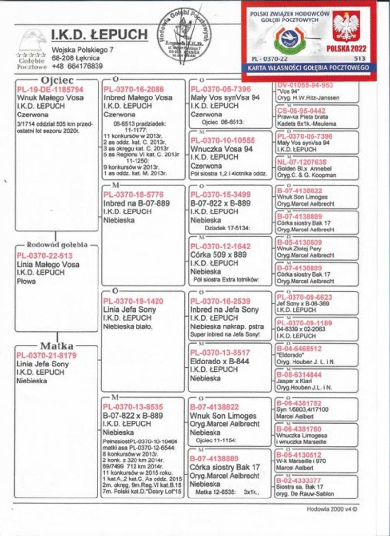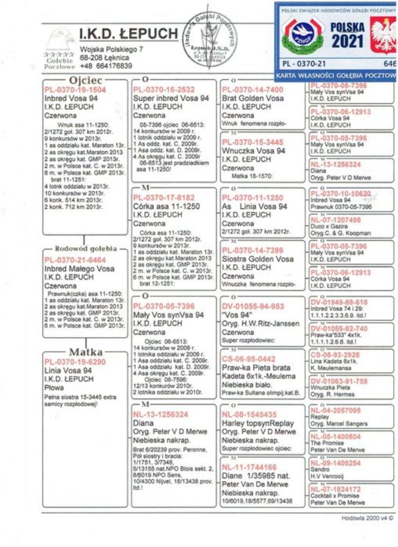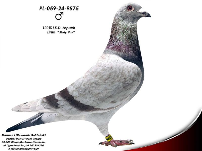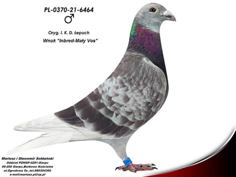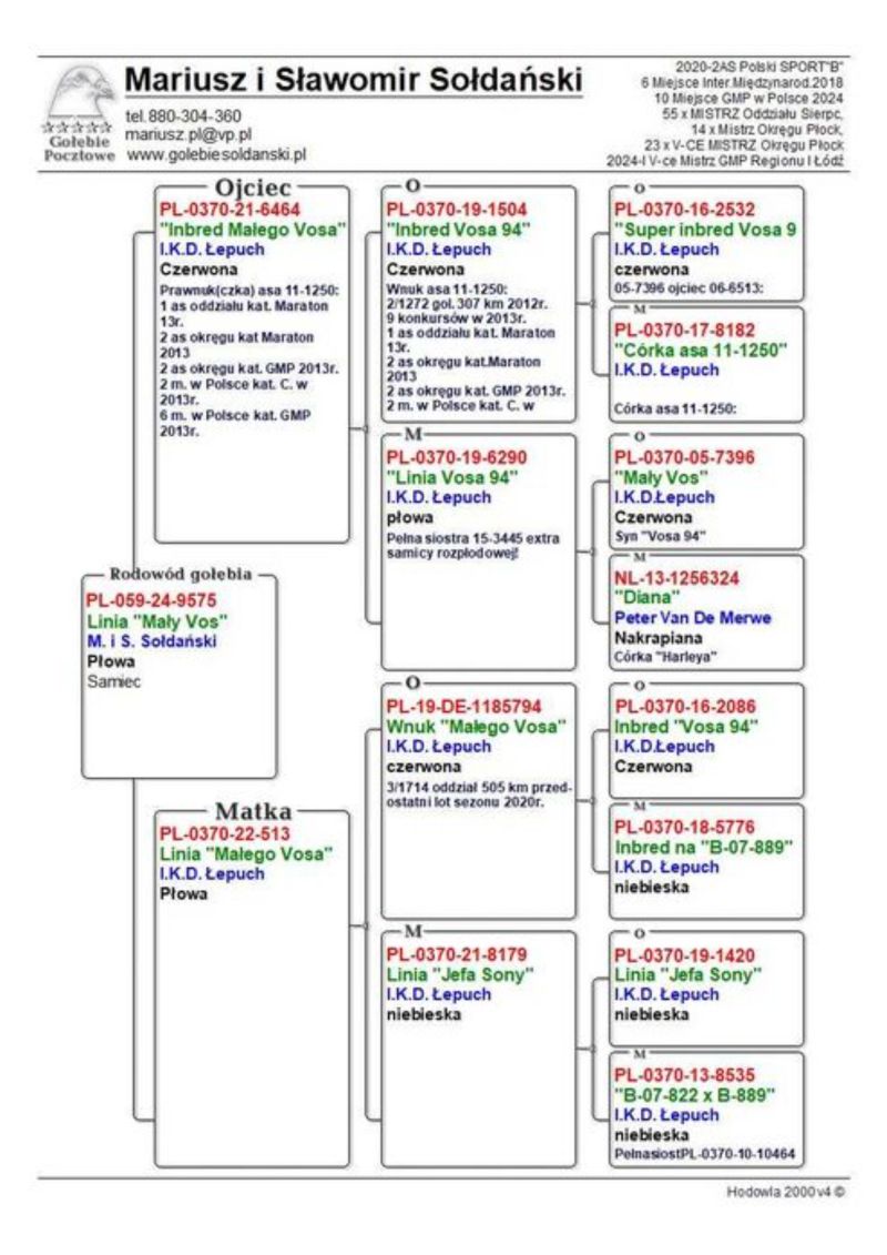 Oryginalny samiec z hodowli M. i S. Sołdańscy super Linia Jef Sony, "Mały Vos,"Vos 94" I.K.D. Łepuch .Więcej informacji o gołębiu pod nr tel. i poniższych materiałach. Nasze wyniki w Mistrzostwie Polski 2018: 6 Miejsce w Intermistrzostwie Międzynarodowym - coeff. 151,73; 23 Miejsce GMP - 1874,73; 29 Miejsce Kat.B - coeff. 86,45. 1 Miejsce Gołąb Średni dystans-Konkurs Redakcji "Hodowca", 1 Miejsce Kat."B"-Konkurs Redakcji "Dobry Lot", 3 Miejsce Kat."D"-Konkurs Redakcji "Dobry Lot", 2 Miejsce "Mistrzostwo Asów Allround"-Konkurs Redakcji "Dobry Lot", 1 Miejsce Kat."B"-Konkurs Redakcji "Poradnik Hodowcy". 2019-Oddział Sierpc: Typowane Mistrz, Open I-vce Mistrz, Open 50 II-V-ce Mistrz, 1 i 3 Lotnik Roczny, Kat. A II V-ce Mistrz, Kat. B II V-ce Mistrz, Kat. D II V-ce Mistrz, Kat. GMP I v-Ce Mistrz, Kat. Inter. I V-ce Mistrz, Super. I V-ce Mistrz. Okręg Płock: II V-ce Mistrz Supermistrzostwo, I V-ce Mistrz GMP, II Lotnik. kat. B. 10 Gołębi w Reprezentacji Okręgu na Wystawę Ogółnopolską 2020. 2 AS POLSKI SPORT „B”-14,62 coef. 2020-Oddział Sierpc: Typowane Mistrz, Open I-vce Mistrz, Open 50 I-V-ce Mistrz, 1 Lotniczka Roczna, Kat. C Mistrz, Kat. M II V-ce Mistrz, Kat. D II V-ce Mistrz, Kat. GMP Mistrz, Kat. Inter. II V-ce Mistrz, Mistrz. Okręg Płock: Kat. GMP Mistrz , Kat.Roczne Mistrz, Kat. C-I Vce Mistrz , Kat. M - I Vce Mistrz Mistrz.Regionu I Łódż- V-ce Mistrz „Roczne” 2021- Supermistrz Oddziału Sierpc Mistrz Okręgu Płock Kat." Maraton" Supermistrz Okręgu Płock,2022 6 gołębi w reprezentacji Okręgu Płock na Wystawę Ogólnopolską.2022- II Supermistrz Oddziału Sierpc, 8 x V-ce Mistrz Oddziału. 1 AS WG Kaszuby 2022, 2 drużyna WG Kosakowo 2022, 4 AS WG Kosakowo. 6 AS WG Roztocze 2022. 6 gołębi w reprezentacji Okręgu Płock na Wystawę Ogólnopolską 2023. 2022-1 Samica w Polsce PL-0281-17-3077 w Kat. "Supermaraton"- Konkurs Redakcji"Hodowca". 2024 - 10 Miejsce w Polsce w kat. GMP 1 Miejsce Finał Wg Zatoka Puck 3 i 6 As Zatoka Puck