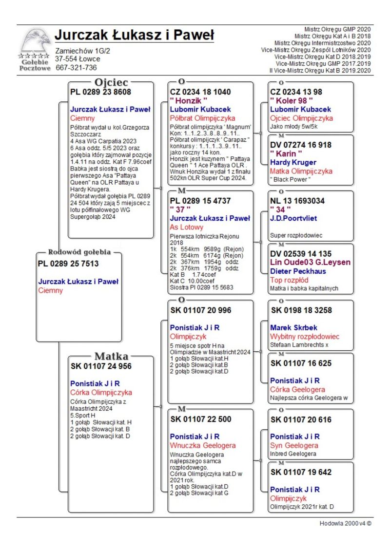 Oryginalny gołąb z Hodowli Jurczak Łukasz i Paweł.Szczegóły pochodzenia w rodowodzie lub po nr.telefonu 667321736 lub 697672645.Wysyłka kurierem 150 zł do 4 gołębi lub odbiór osobisty