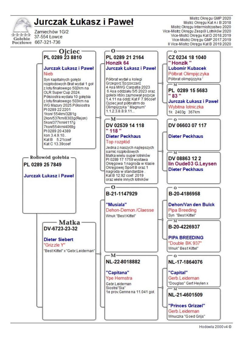 PL-0289-25-7849 Wnuczka Kapitalnej samicy rozpłodowej'118'oraz gołębi Leideman i Best Kittel