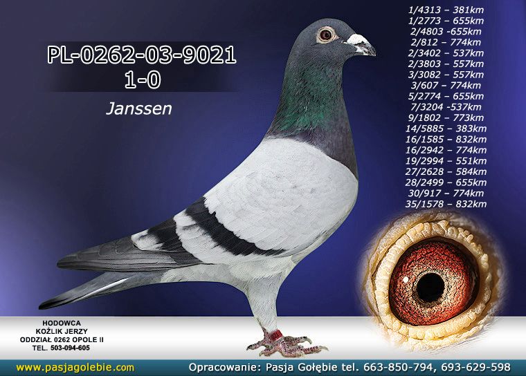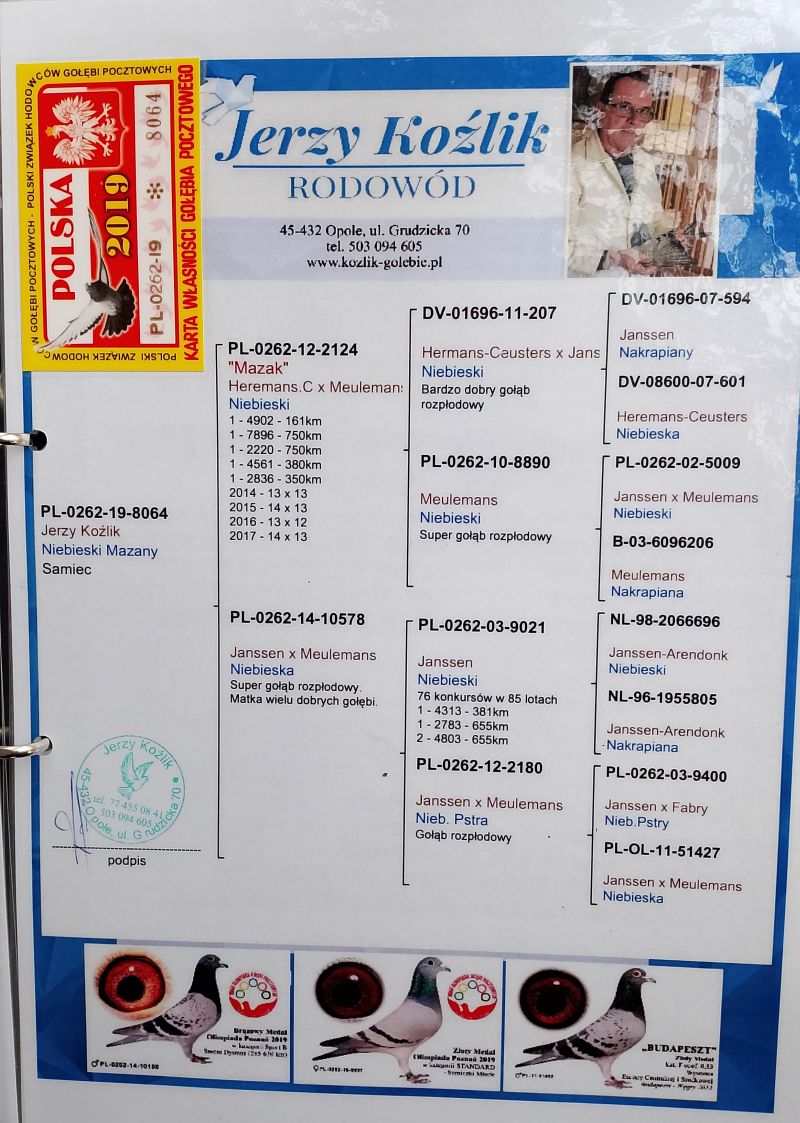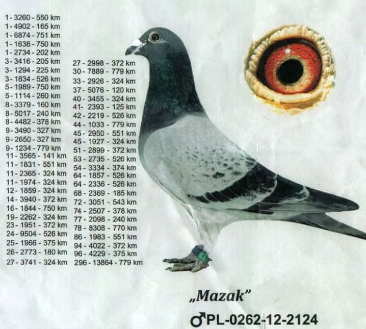 Oryginalny gołąb z hodowli Jerzego Koźlika, syn słynnego "Mazaka" 2124 z hodowli Jerzego Koźlika. 2124 był 5 razy 1-szy w Oddziale na wszystkich dystansach. W kolejnych latach zdobywał: 13, 13, 12, 13 konkursów. Oferowany samczyk jest jednocześnie wnukiem słynnego 9021, który zdobył 76 konkursów. Odbiór: Najlepiej bezpośrednio w Opolu lub do uzgodnienia kurierem.