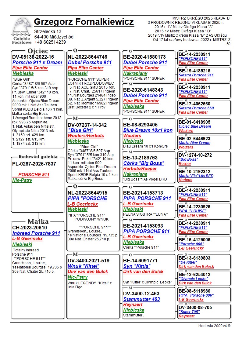 Gołębie z tej lini od wielu lat przyczyniały się do zdobycia takich sukcesów jak :
