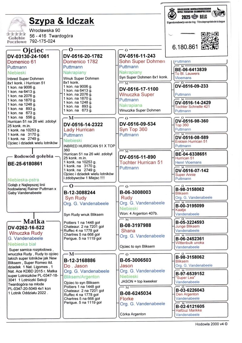 Profesjonalna hodowla z wieloletnim doświadczeniem, posiadająca w swoim stadzie materiał najwyższej światowej klasy. Więcej informacji w załączonych materiałach oraz pod nr tel. 792-175-024 Oferowany gołąb to prawdopodobnie SAMICA. Płeć pisana orientacyjnie Wysyłka 100 zł