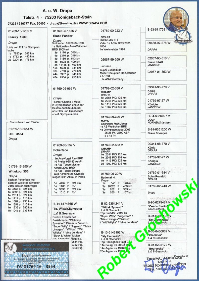Oryginalny gołąb z hodowli Roberta Grochowskiego. Szczegóły pochodzenia w rodowodzie. Oferowany gołąb to prawdopodobnie SAMICA. Więcej informacji pod numerem 600133330 Sprzedający może zorganizować transport gołębia do najbliższego miasta od miejscowości kupującego za około 70-100zł Przy opcji "KUP TERAZ" transport gołębia GRATIS (do najbliższego miasta od miejsca zamieszkania kupującego).