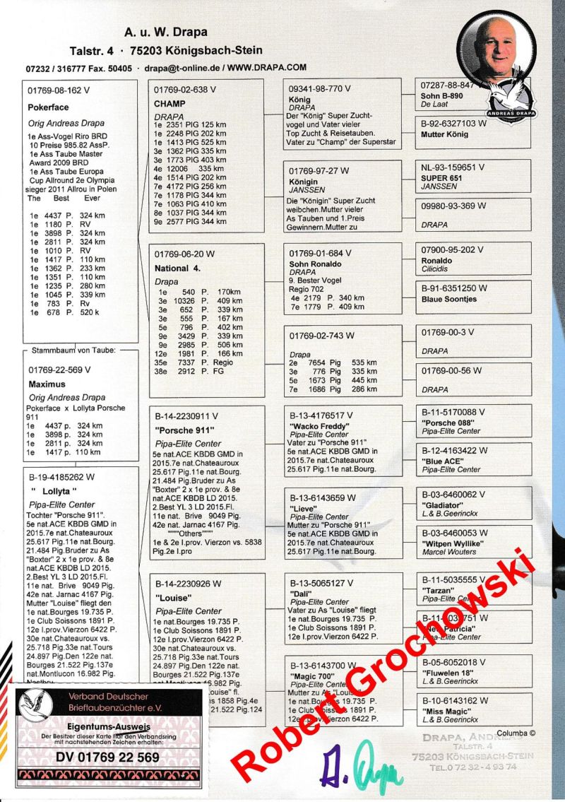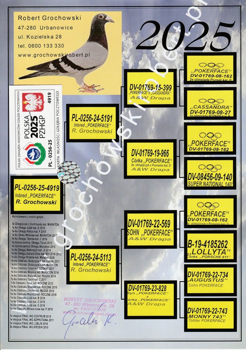 Oryginalny gołąb z hodowli Roberta Grochowskiego. Szczegóły pochodzenia w rodowodzie. Oferowany gołąb to prawdopodobnie SAMICA. Więcej informacji pod numerem 600133330 Sprzedający może zorganizować transport gołębia do najbliższego miasta od miejscowości kupującego za około 70-100zł Przy opcji "KUP TERAZ" transport gołębia GRATIS (do najbliższego miasta od miejsca zamieszkania kupującego).