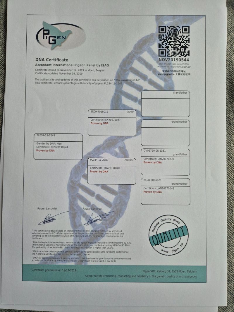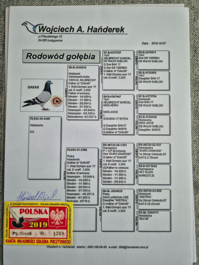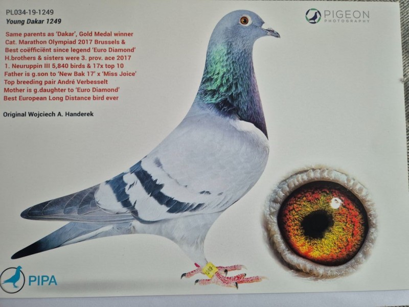 Oryginalny Gołąb z hodowli Wojciech Handerek. Pełna siostra olimpijczyka Dakar .Więcej informacji w rodowodzie oraz pod numerem telefonu 516512745