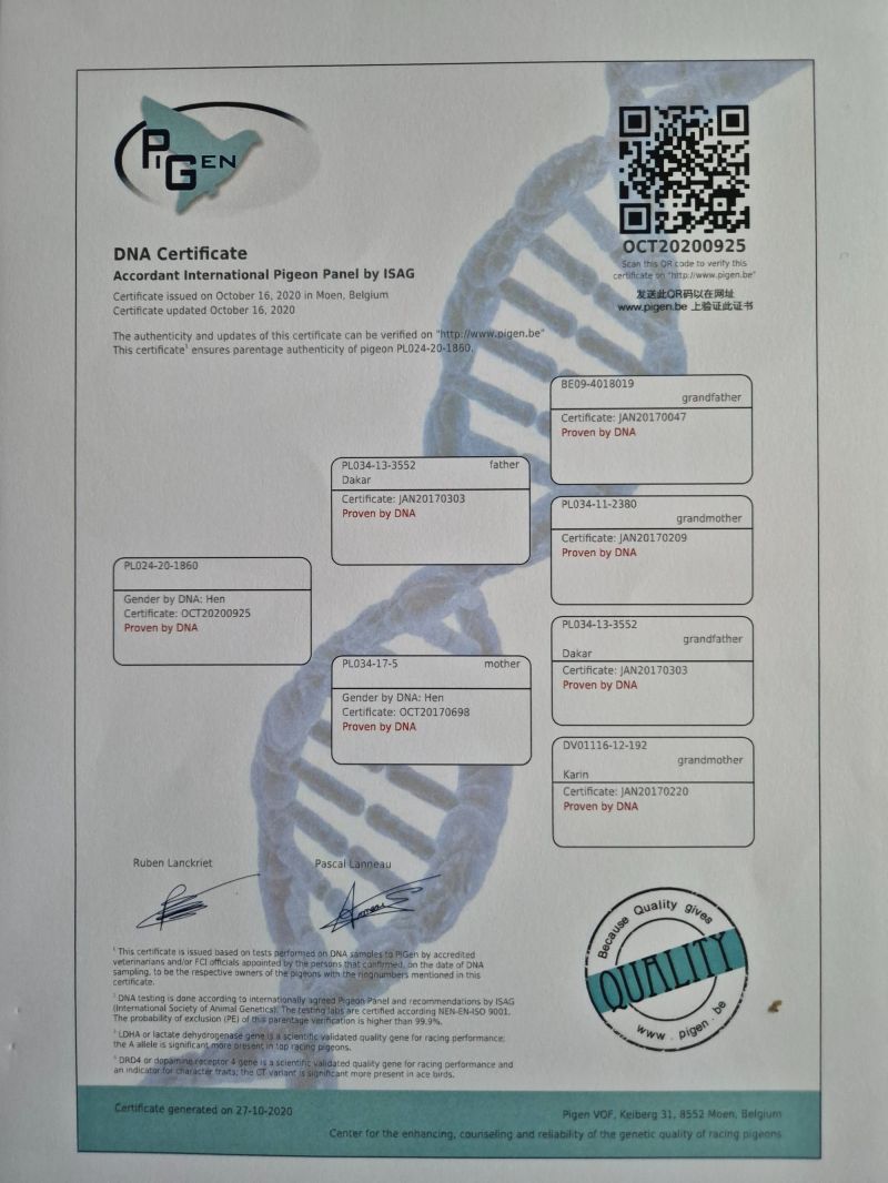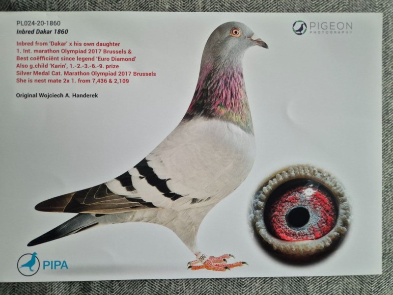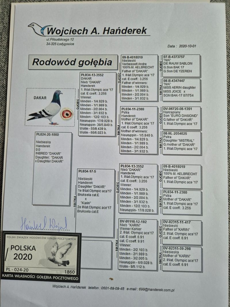 Oryginalny Gołąb z hodowli Wojciech Handerek, córka olimpijczyka Dakara.Matka 21 z finału 430km Corabia 2025 .Więcej informacji w rodowodzie oraz pod numerem telefonu 516512745