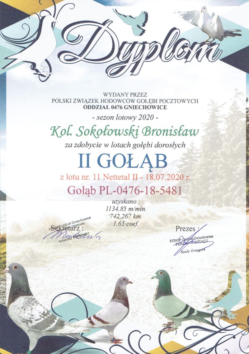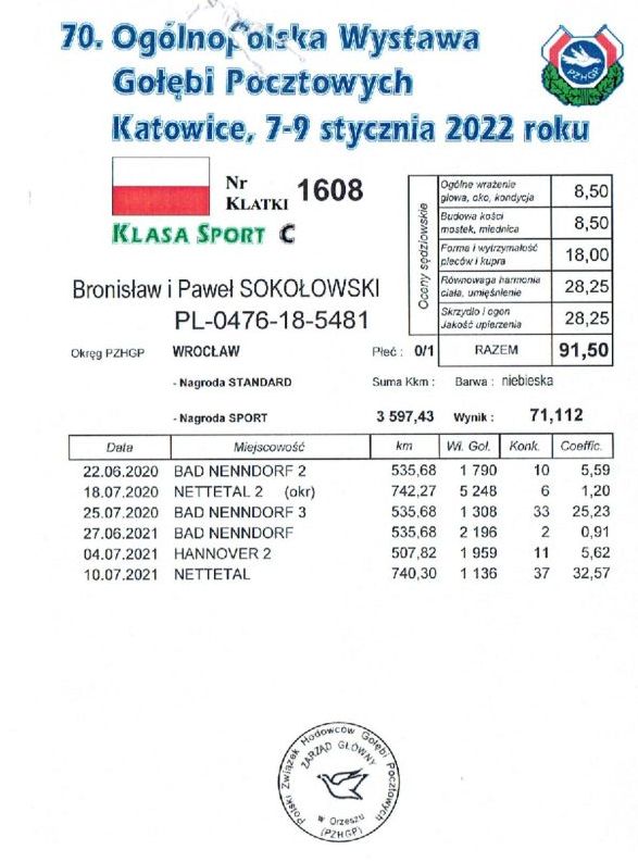 Z racji tego, iż od dwóch lat lotujemy tylko i wyłącznie samicami do odstąpienia mamy nadwyżkę samców z roku 2025 i 2024 – gołębie te były lotowane jako młode i przeszły cały program lotowy. Gołębie roczne w 2025 roku były partnerami do samic lotowych. Gołębie wywodzą się z naszych najlepszych gołębi lotowych i rozpłodowych – szczegóły w rodowodach. Istnieje możliwość po wylicytowaniu ich, na odebranie gołębi na Międzynarodowych Targach Gołebi Pocztowych w EXPOGołębie w Katowicach w dniu 10.01.2026 W tym rok 2025 lotując tylko 33 samicami zdobyliśmy: MISTRZOSTWO POLSKI KATEGORIA „B” -95 Przodownik; MISTRZOSTWO REGIONU V 2025 - KATEGORIA "B"-14 Przodownik MISTRZOSTWO OKRĘGU WROCŁAW 2025 KATEGORIA "B"- 6 Przodownik MISTRZ ODDZIAŁU 2025 KATEGORIA "B Kategoria Wystawowa Sport A -2, 3, 12. 24, 36 gołąb Kategoria Wystawowa Sport B -1, 4, 5, 14, 44 gołąb Kategoria Wystawowa Sport D – 2, 4, 5, 23 gołąb Kategoria Wystawowa Sport W – 8, 11, 12, 13, 17, 22, 32 gołąb Kategoria Wystawowa Olimpijski Standard Samice – 5, 6, 8 ,9, 10, 13, 16, 22, 57 gołąb