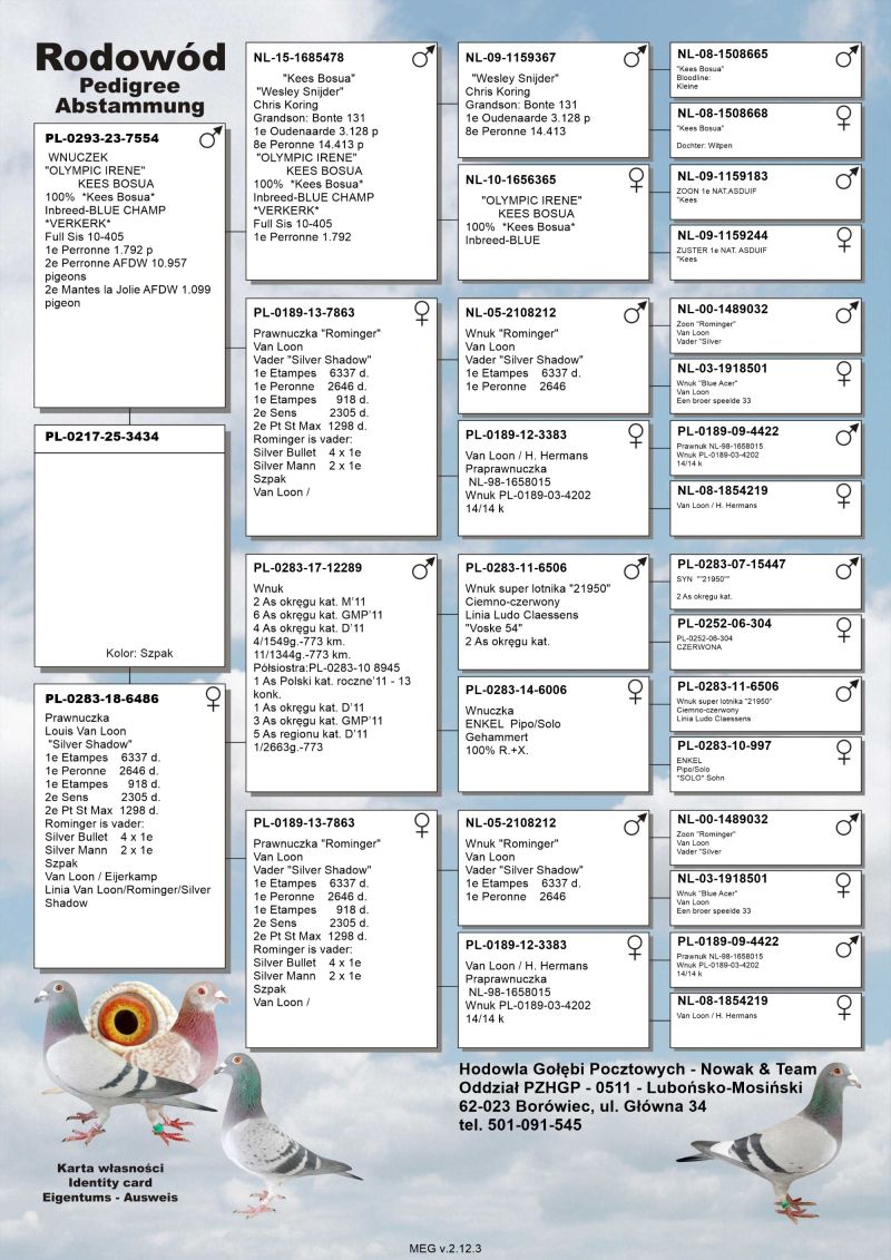 Oryginalny gołąb z hodowli Nowak & Team, szczegóły pochodzenia, rodowód poniżej.