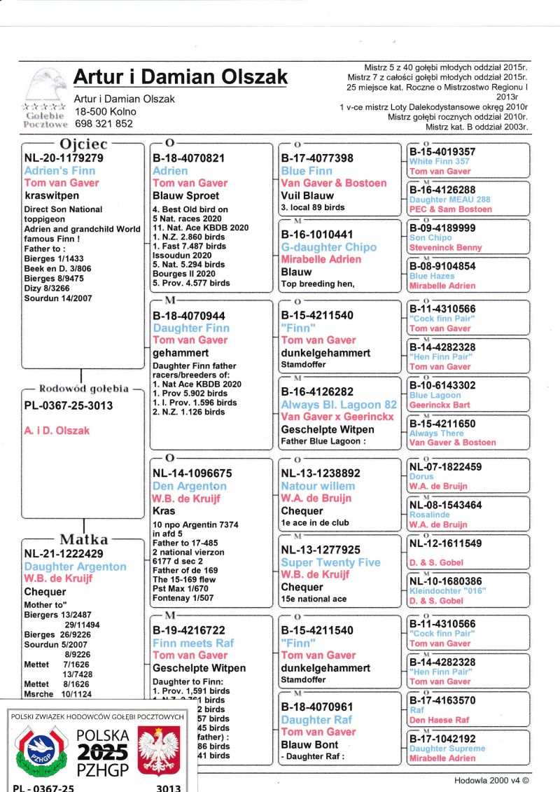 Potomkowie Finna 1-10934, 1-10811, 1-6112, 1-5902, 1-4525, 1 As Belgii 2020, 1 z finału Victoria Falls 2022. Gołąb zaszczepiony przeciwko paramiksowirozie. Więcej informacji udzielę telefonicznie.
