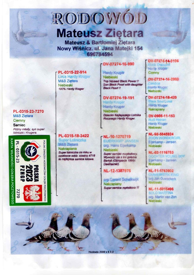 Oryginalny gołąb z hodowli Mateusza Ziętary. Szczegóły pochodzenia w rodowodzie. Więcej informacji pod nr tel.: 607063552