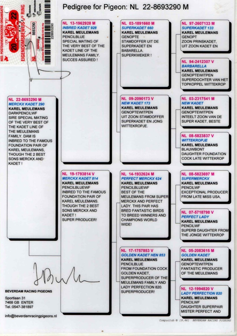 NL-2022-8693290 - oryg. Beverdam Racing Pigeons INBRED NA KADETA 100% KAREL MEULEMANS