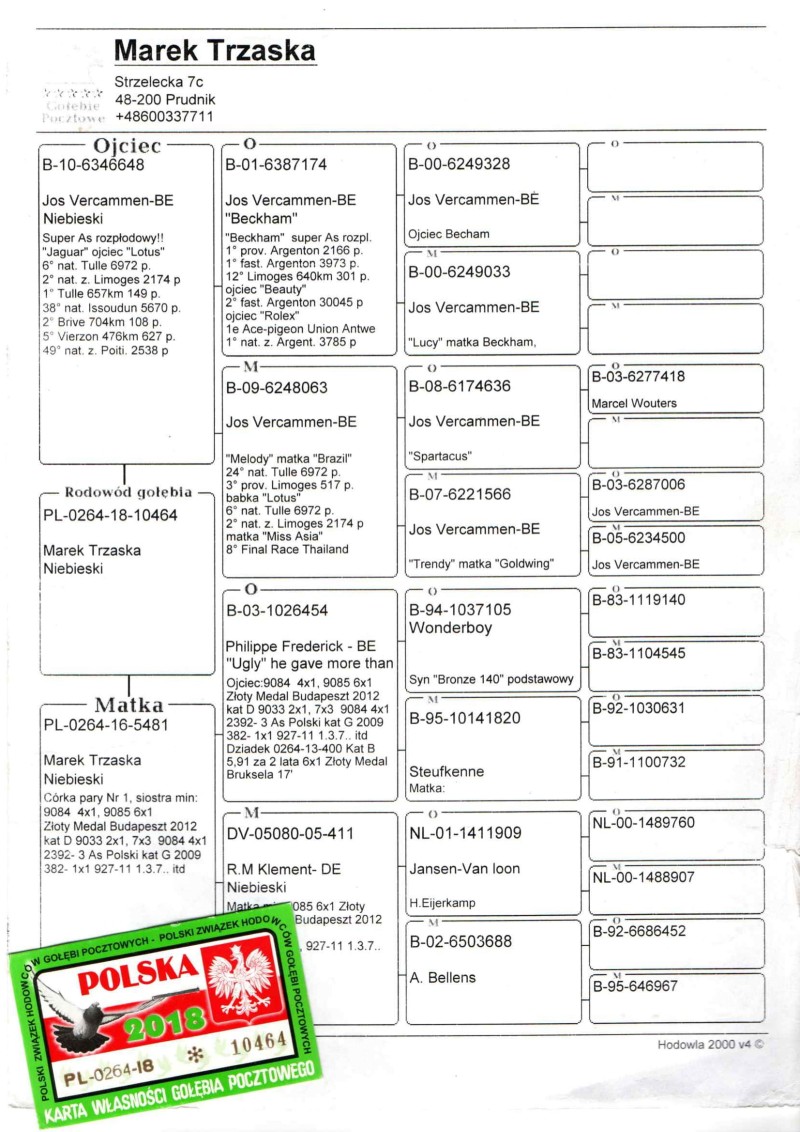 Oryginalny gołąb z hodowli Marka Trzaski. Szczegóły pochodzenia w rodowodzie. Więcej informacji pod nr tel.: 607063552 **przed zalicytowaniem proszę o kontakt z właścicielem w sprawie płci oferowanego gołębia
