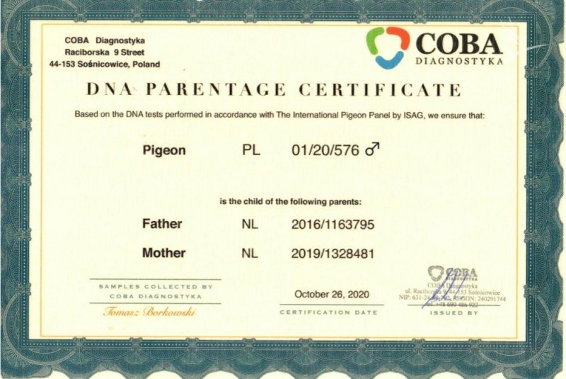 Gołąbek posiada Certyfikat DNA. Wnuczka "MG 430" "Summerian Fighter". 1. Int. Barcelona 2017 oraz "Saar" 2. Nat. /4. Int. Barcelona 2017.