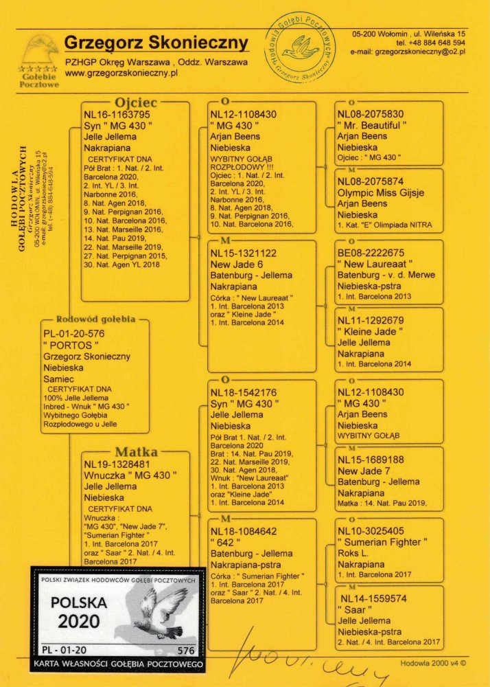 ** ZMIANA PROFILU HODOWLI*** Oryginalny gołąb z hodowli Grzegorza Skoniecznego. Szczegóły pochodzenia w rodowodzie. Więcej informacji pod nr tel.: 506053616 OJCIEC: NL-16-1163795 (SYN „MG 430”) Syn „430” Wybitnego Gołębia Rozpłodowego u J. Jellema oraz Wnuk: „Miss Gijsje” 1. Miejsce Olimpiada Nitra 2013 Kat. „E” 9,25coef., „New Laureaat” 1 Int. Barcelona 2013 na 25382g., „Kleine Jade” 1 Int. Barcelona 2014 na 20669g. MATKA: NL-19-1328481 (WNUCZKA „MG 430”)