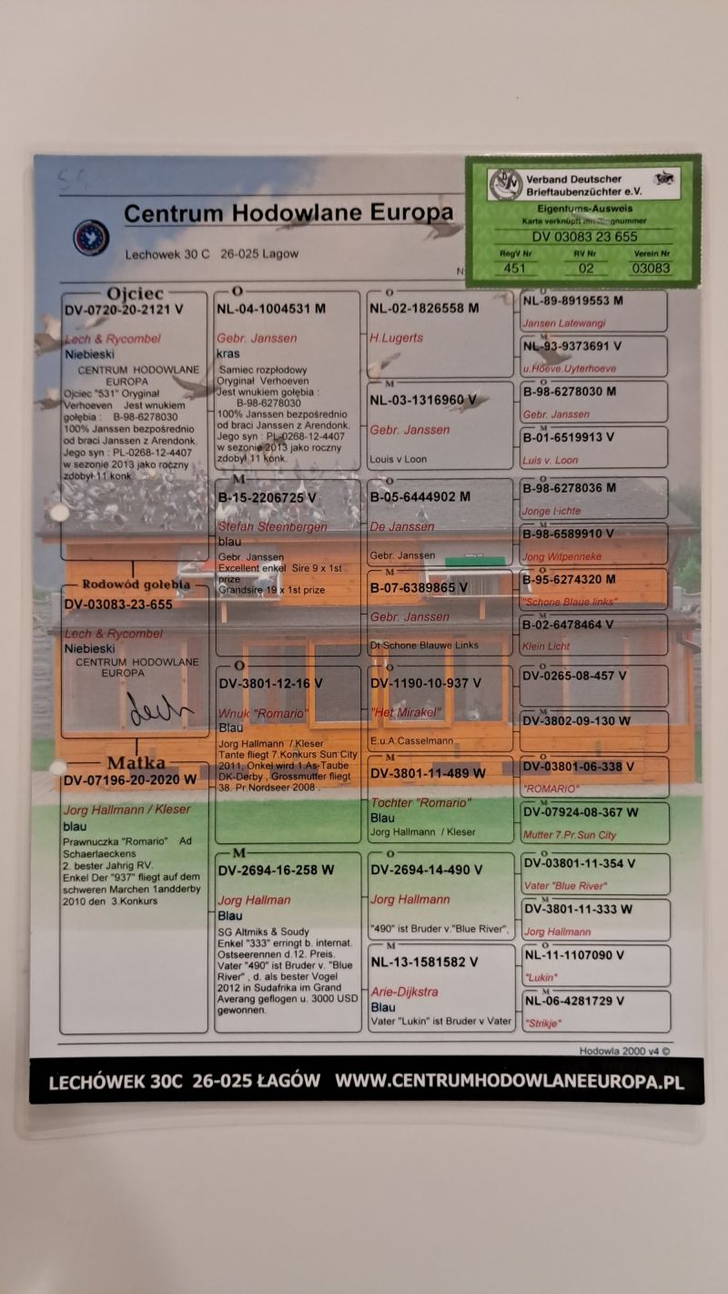 DV-03083-23-655 oryg. Centrum Hodowlane Europa Janssen 100% x Jorg Hallaman "Romario"