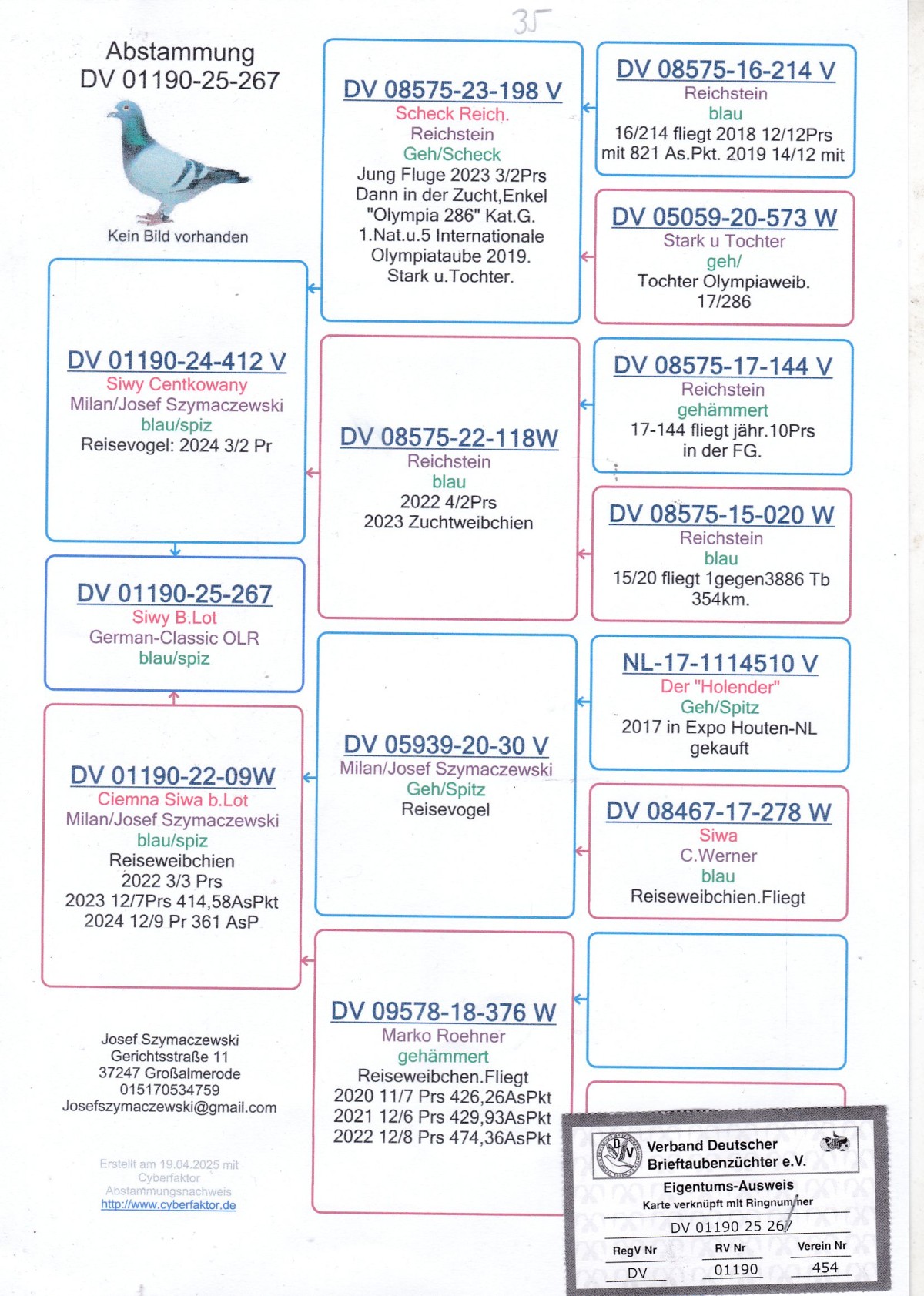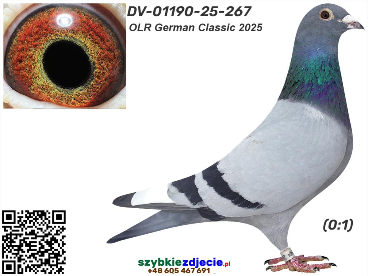 OLR German Classic 2025 Gołąb brał udział w lotach na OLR German Classic. Wyniki lotowe dostępne na stronie internetowej. Szczegóły pochodzenia w rodowodzie. Gołąb znajduje się w Polsce, można go obejrzeć w miejscowości Zblewo (woj. pomorskie), po wcześniejszym kontakcie telefonicznym. Więcej informacji o gołębiu i transporcie pod nr tel.: 511 607 710.