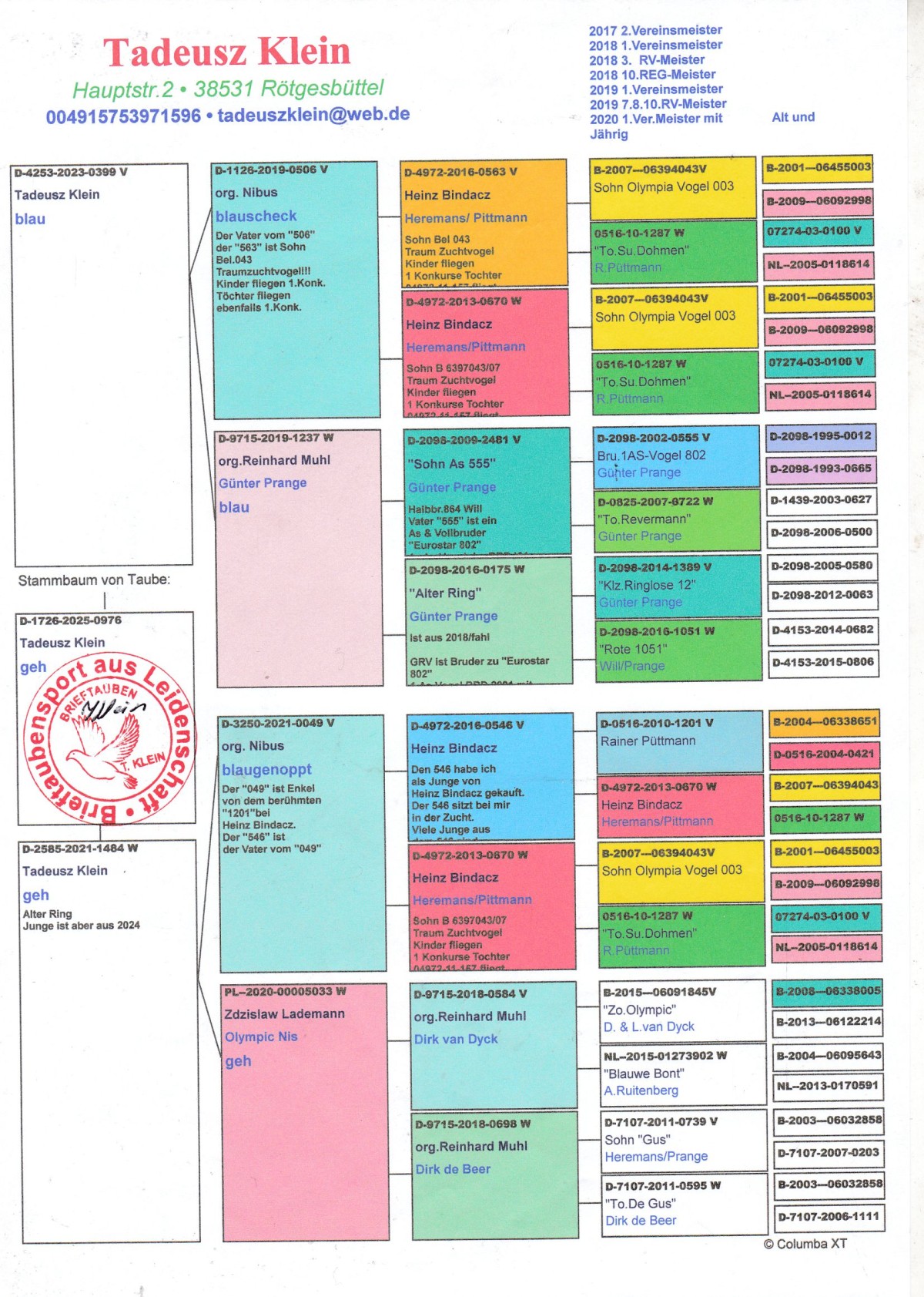 OLR German Classic 2025 Gołąb brał udział w lotach na OLR German Classic. Wyniki lotowe dostępne na stronie internetowej. Szczegóły pochodzenia w rodowodzie. Gołąb znajduje się w Polsce, można go obejrzeć w miejscowości Zblewo (woj. pomorskie), po wcześniejszym kontakcie telefonicznym. Więcej informacji o gołębiu i transporcie pod nr tel.: 511 607 710.