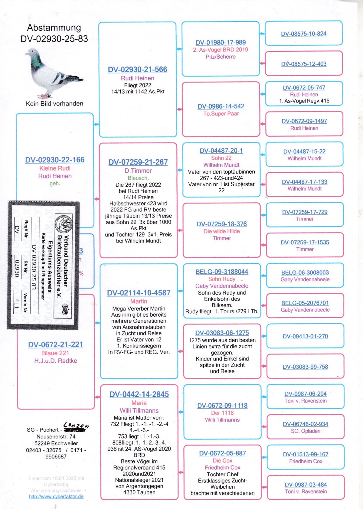 OLR German Classic 2025 Gołąb brał udział w lotach na OLR German Classic. Wyniki lotowe dostępne na stronie internetowej. Szczegóły pochodzenia w rodowodzie. Gołąb znajduje się w Polsce, można go obejrzeć w miejscowości Zblewo (woj. pomorskie), po wcześniejszym kontakcie telefonicznym. Więcej informacji o gołębiu i transporcie pod nr tel.: 511 607 710.
