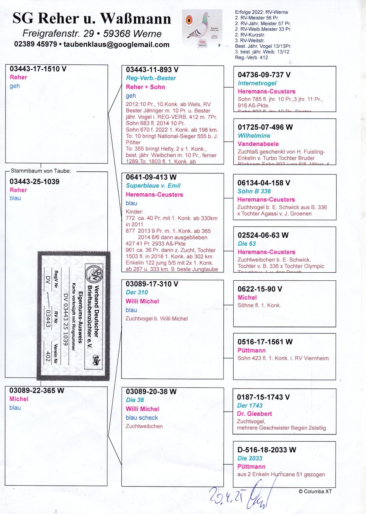 OLR German Classic 2025 Gołąb brał udział w lotach na OLR German Classic. Wyniki lotowe dostępne na stronie internetowej. Szczegóły pochodzenia w rodowodzie. Gołąb znajduje się w Polsce, można go obejrzeć w miejscowości Zblewo (woj. pomorskie), po wcześniejszym kontakcie telefonicznym. Więcej informacji o gołębiu i transporcie pod nr tel.: 511 607 710.