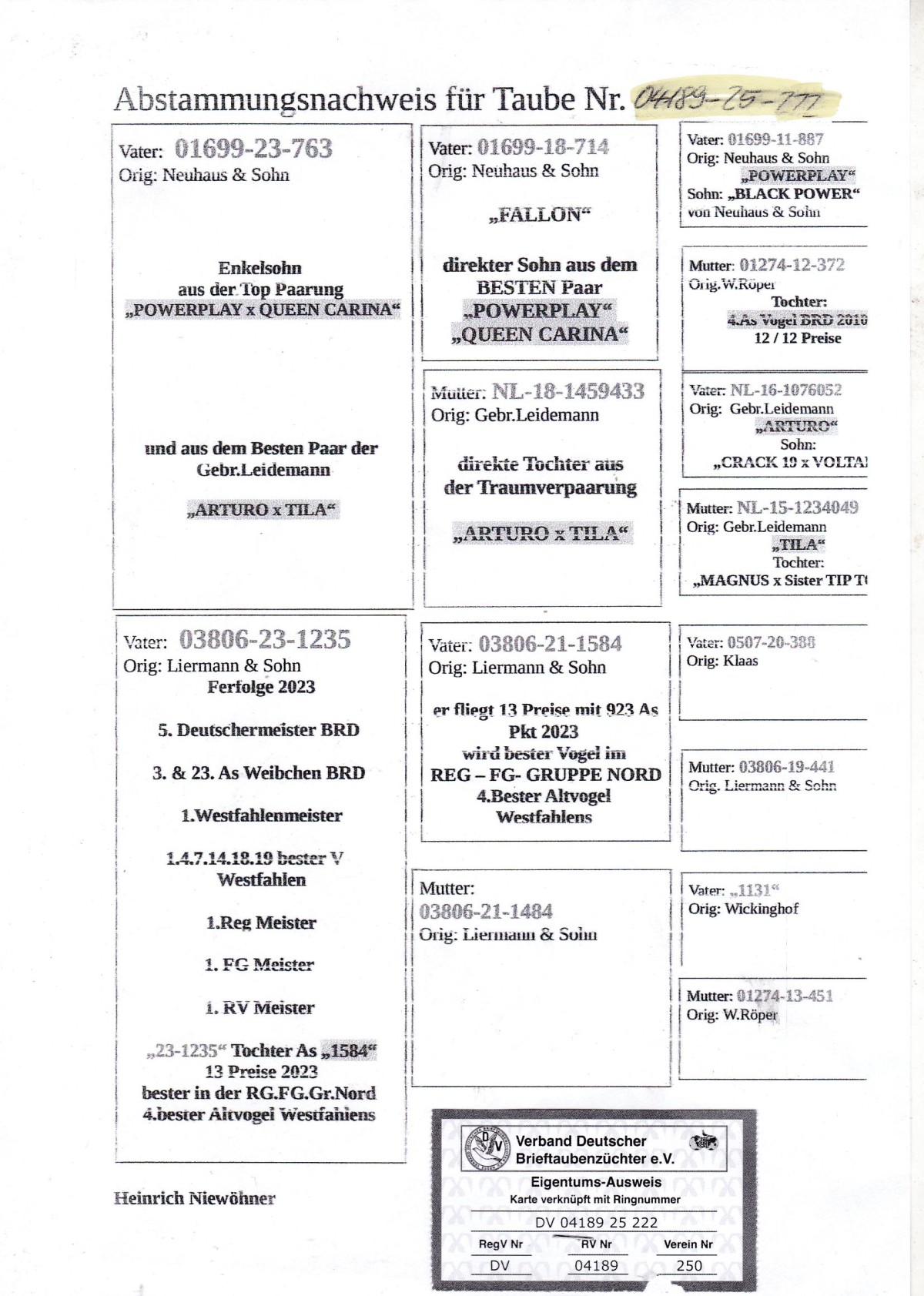OLR German Classic 2025 Gołąb brał udział w lotach na OLR German Classic. Wyniki lotowe dostępne na stronie internetowej. Szczegóły pochodzenia w rodowodzie. Gołąb znajduje się w Polsce, można go obejrzeć w miejscowości Zblewo (woj. pomorskie), po wcześniejszym kontakcie telefonicznym. Więcej informacji o gołębiu i transporcie pod nr tel.: 511 607 710.
